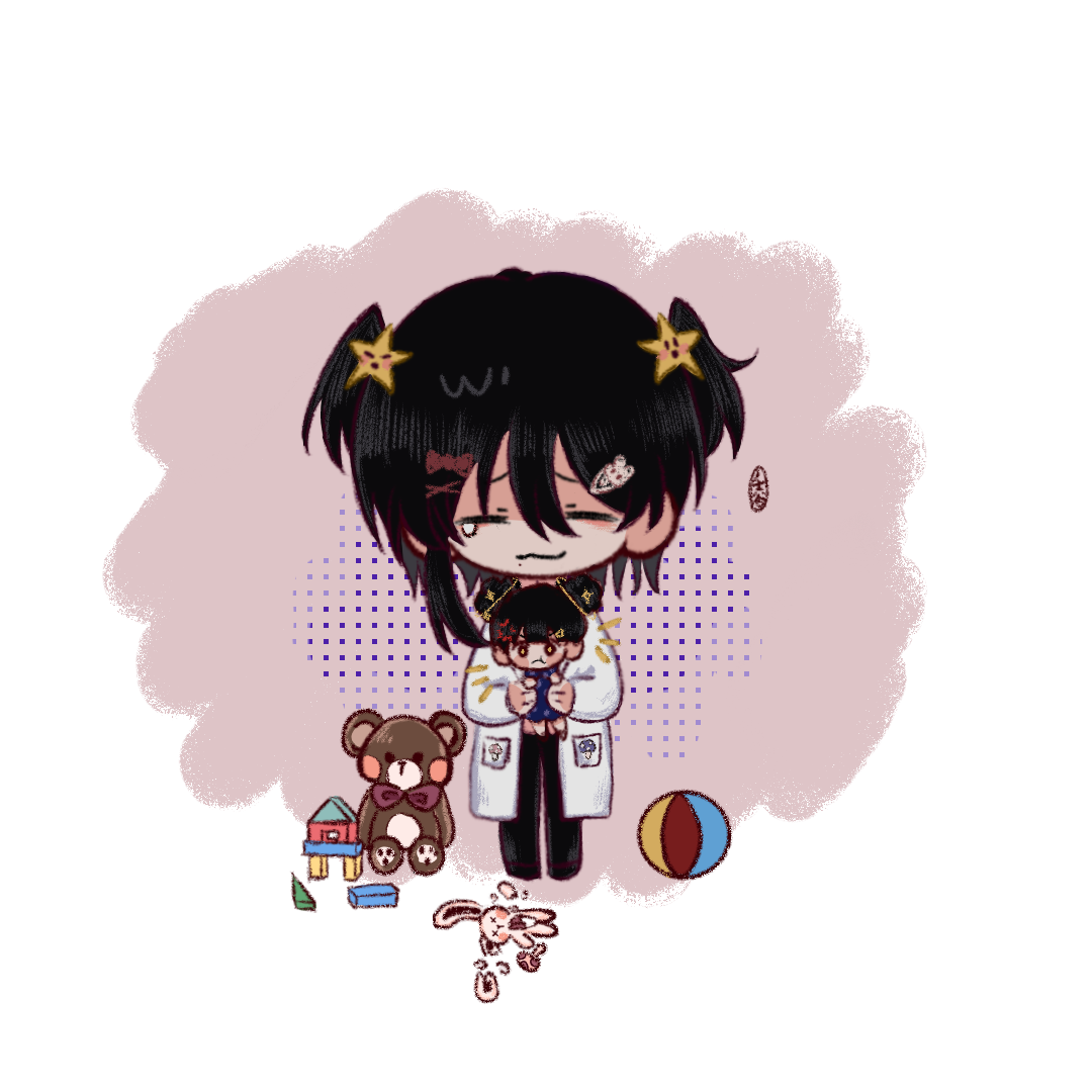 1boy 1girl =_= alternate_hairstyle anger_vein ball black_hair black_pants blue_dress bow chibi chibi_only chinese_commentary closed_mouth commentary_request dress hair_between_eyes hair_bow hair_ornament lab_coat medium_hair mo_chengwei mole mole_under_mouth open_clothes pants red_bow rengujiang single_sidelock star_(symbol) star_hair_ornament stuffed_animal stuffed_rabbit stuffed_toy teardrop teddy_bear tong_lingshen touqi_guaitan toy_block two_side_up x_hair_ornament