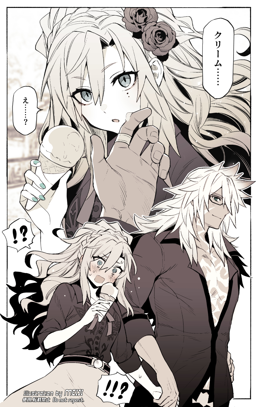 !? 1boy 1girl @_@ artist_name belt blue_nails blush braid collarbone collared_shirt crown_braid dark-skinned_male dark_skin embarrassed fate/grand_order fate_(series) flower food food_on_face glasses green_eyes grey_eyes hair_between_eyes hair_flower hair_ornament hand_on_own_hip hetero highres holding holding_hands holding_ice_cream_cone ice_cream ice_cream_cone ice_cream_on_face jewelry kriemhild_(fate) long_hair meiji_ken mole mole_under_eye open_mouth pectoral_cleavage pectorals ponytail ring rose scar scar_on_chest shirt sidelocks siegfried_(fate) siegfried_(super_cool_biz)_(fate) sleeves_rolled_up smile speech_bubble spoken_interrobang spot_color sweat wiping_face