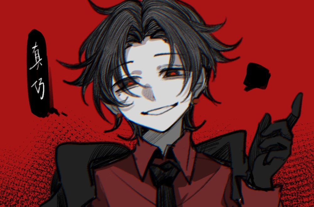 1boy black_hair black_jacket chinese_commentary chinese_text chromatic_aberration collared_shirt commentary_request grin hand_up index_finger_raised jacket jacket_on_shoulders long_sleeves male_focus parted_bangs portrait red_background red_eyes red_shirt shirt short_hair smile solo touqi_guaitan translation_request yaobu_haishi_shujiao_ba zhu_yaoxing