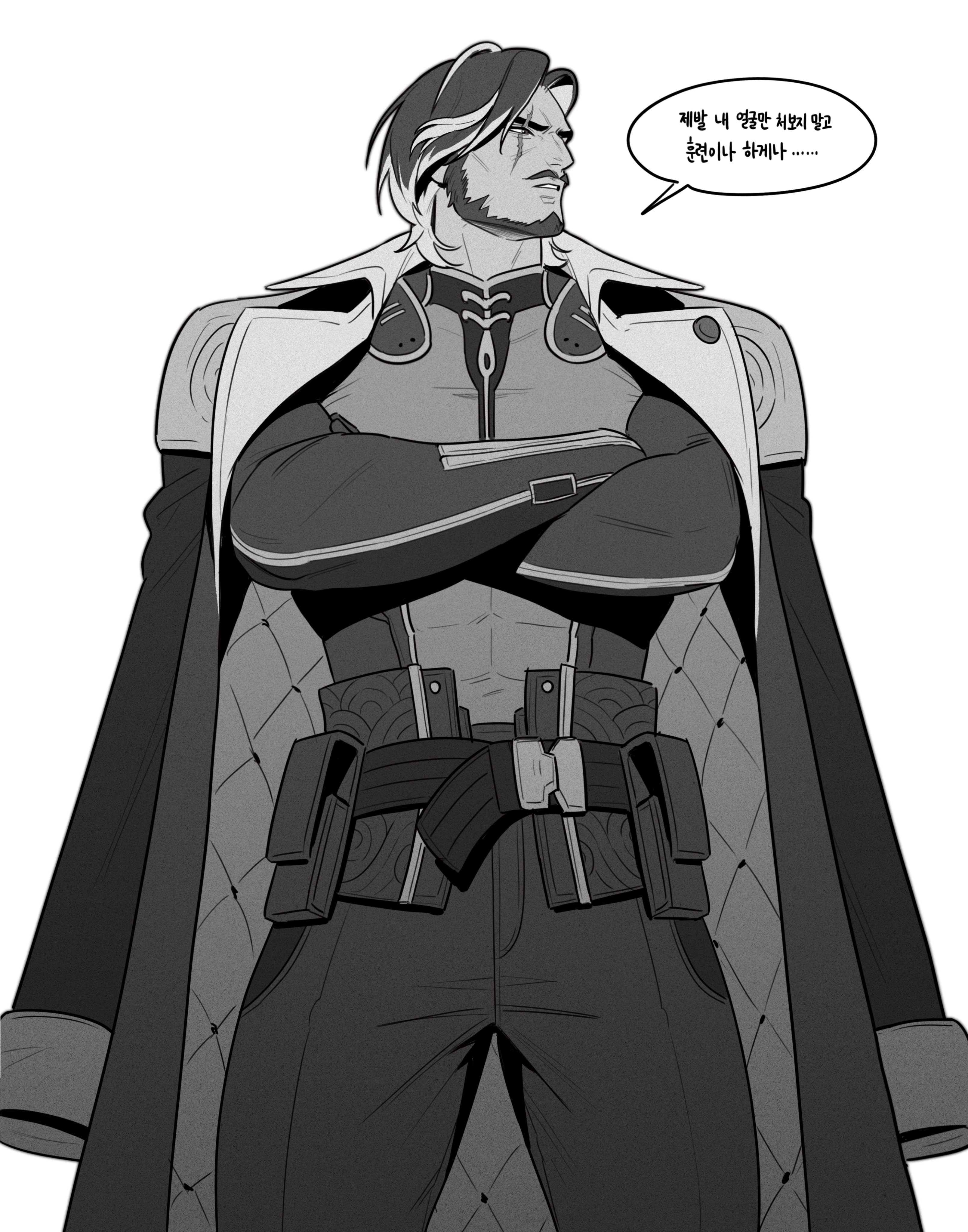 1boy absurdres bara bingbing_nakso chinstrap coat crossed_arms facial_hair greyscale highres korean_commentary korean_text monochrome mustache open_clothes open_coat pencil_mustache scar scar_across_eye scar_on_face wuthering_waves yhan_(wuthering_waves)