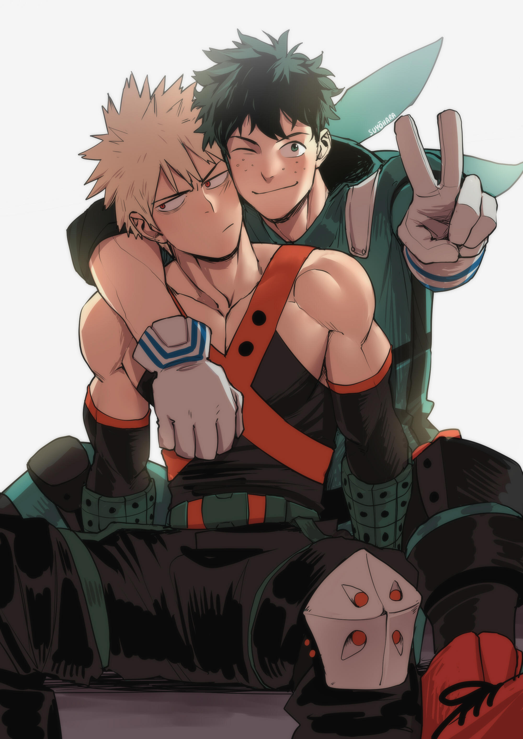 2boys absurdres aged_up alternate_body_size artist_name bakugou_katsuki blonde_hair boku_no_hero_academia closed_mouth collarbone commentary costume english_commentary freckles green_eyes green_hair highres hugging_with_one_arm light_frown looking_at_viewer male_focus midoriya_izuku multiple_boys one_eye_closed pectoral_cleavage pectorals red_eyes red_footwear smile spiked_hair suyohara v white_background