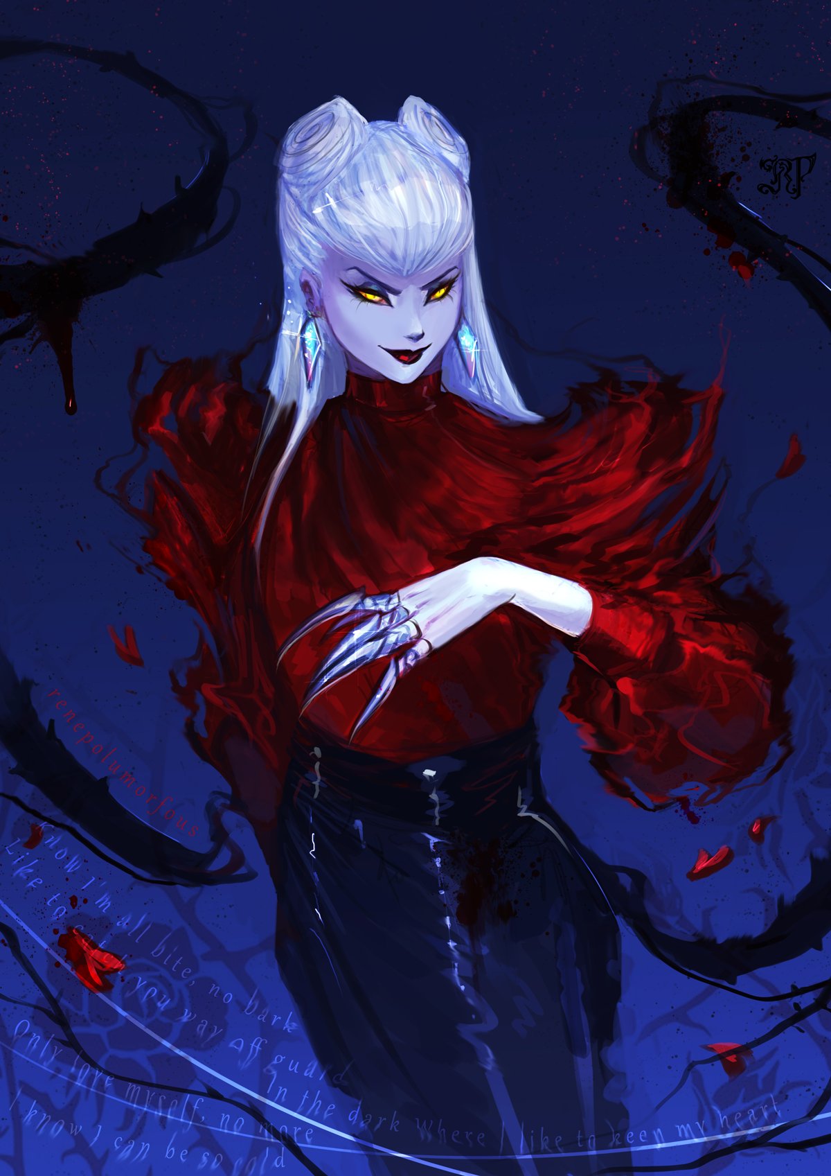 1girl black_skirt claw_(weapon) cone_hair_bun demon_girl earrings evelynn_(league_of_legends) hair_bun highres jewelry k/da_all_out_evelynn league_of_legends long_hair long_sleeves puffy_long_sleeves puffy_sleeves red_shirt renepolumorfous shirt skirt solo the_baddest_evelynn weapon white_hair yellow_eyes