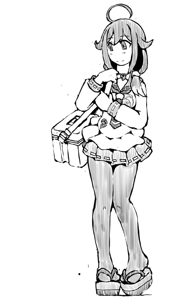 1girl ahoge apron commentary_request cooler greyscale hair_over_shoulder kantai_collection low_ponytail magatama monochrome neckerchief pantyhose pleated_skirt ponytail school_uniform serafuku skirt smile solo taigei_(kancolle) task_(s_task80)