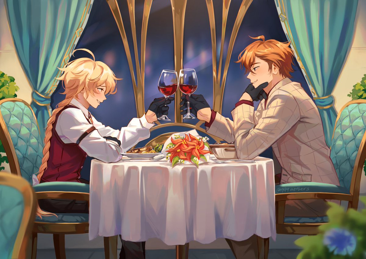 2boys 999aethers aether_(genshin_impact) ahoge alcohol black_gloves black_pants blonde_hair blue_eyes blue_flower blurry blush bouquet bow bowl braid brown_pants bush buttons chair checkered_clothes checkered_jacket collared_shirt commentary cup curtains dating drinking_glass english_commentary floor flower food genshin_impact gloves hair_between_eyes hair_bow half-closed_eyes hand_on_own_chin hand_up holding holding_cup indoors jacket long_hair long_sleeves looking_at_another low-braided_long_hair low-tied_long_hair male_focus meat multiple_boys necktie orange_hair orange_necktie pants plate puffy_long_sleeves puffy_sleeves red_flower red_shirt red_vest shirt short_hair sitting smile smug steak table tartaglia_(genshin_impact) teeth vest white_bow white_jacket white_shirt window wine wine_glass yaoi yellow_eyes