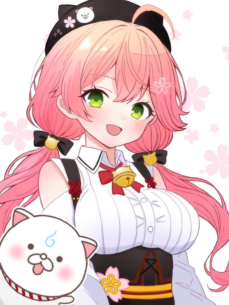 1girl :d ahoge animal_ears arms_at_sides bell beret black_bow black_hat bow bowtie brown_corset cat cat_ears cat_hair_ornament clothing_cutout collared_shirt corset dot_nose fake_animal_ears floating_hair floral_background flower fuminshou_(nekopan_art) green_eyes hair_between_eyes hair_bow hair_intakes hair_ornament hairclip hat hat_flower head_tilt hololive jingle_bell kintoki_(sakura_miko) light_blush long_hair looking_at_viewer low_twintails neck_bell official_alternate_costume open_mouth pink_flower pink_hair red_bow red_bowtie sakura_miko sakura_miko_(casual) shirt shoulder_cutout sidelocks simple_background smile twintails underbust upper_body virtual_youtuber waving white_background white_cat white_shirt