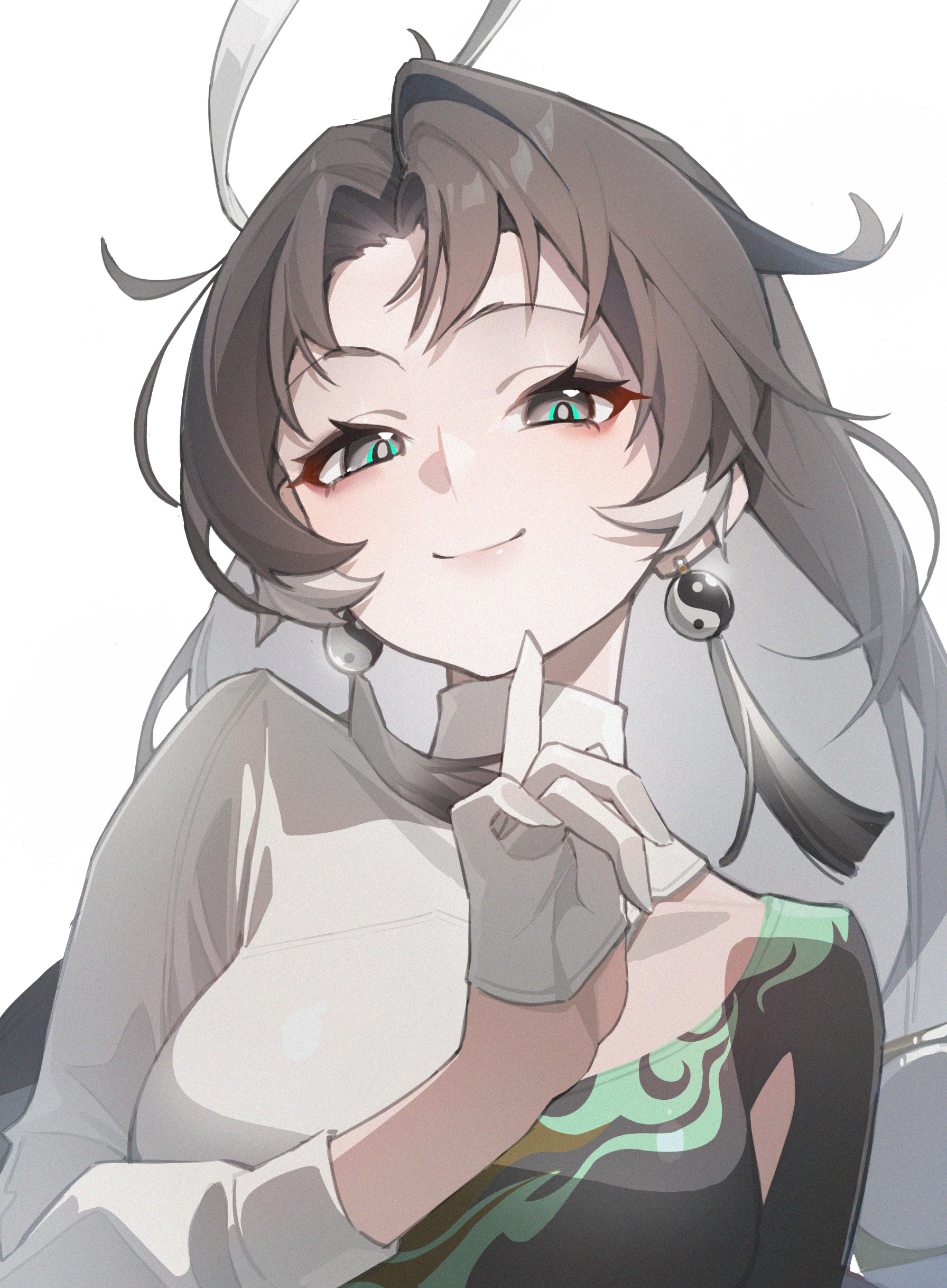 1girl absurdres ahoge artistic_error azusa_hina black_eyes black_hair black_shirt chinese_commentary clothing_cutout colored_inner_hair commentary curtained_hair earrings eyeliner flame_print from_below gloves green_pupils half_gloves highres huge_ahoge index_finger_raised jewelry jianxin_(wuthering_waves) looking_at_viewer looking_down makeup mudra multicolored_hair parted_bangs red_eyeliner shirt shoulder_cutout simple_background smile solo streaked_hair tassel tassel_earrings turtleneck two-tone_shirt upper_body white_background white_gloves white_hair white_shirt wuthering_waves yin_yang yin_yang_earrings