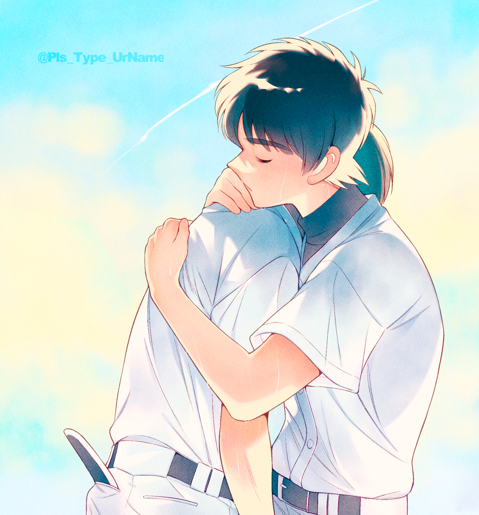 2boys artist_name belt black_hair brothers closed_eyes day highres hug male_focus mix_(manga) multiple_boys outdoors pants shirt short_hair short_sleeves siblings standing step-siblings tachibana_souichiro tachibana_touma white_pants white_shirt yonban_(pls_type_urname)