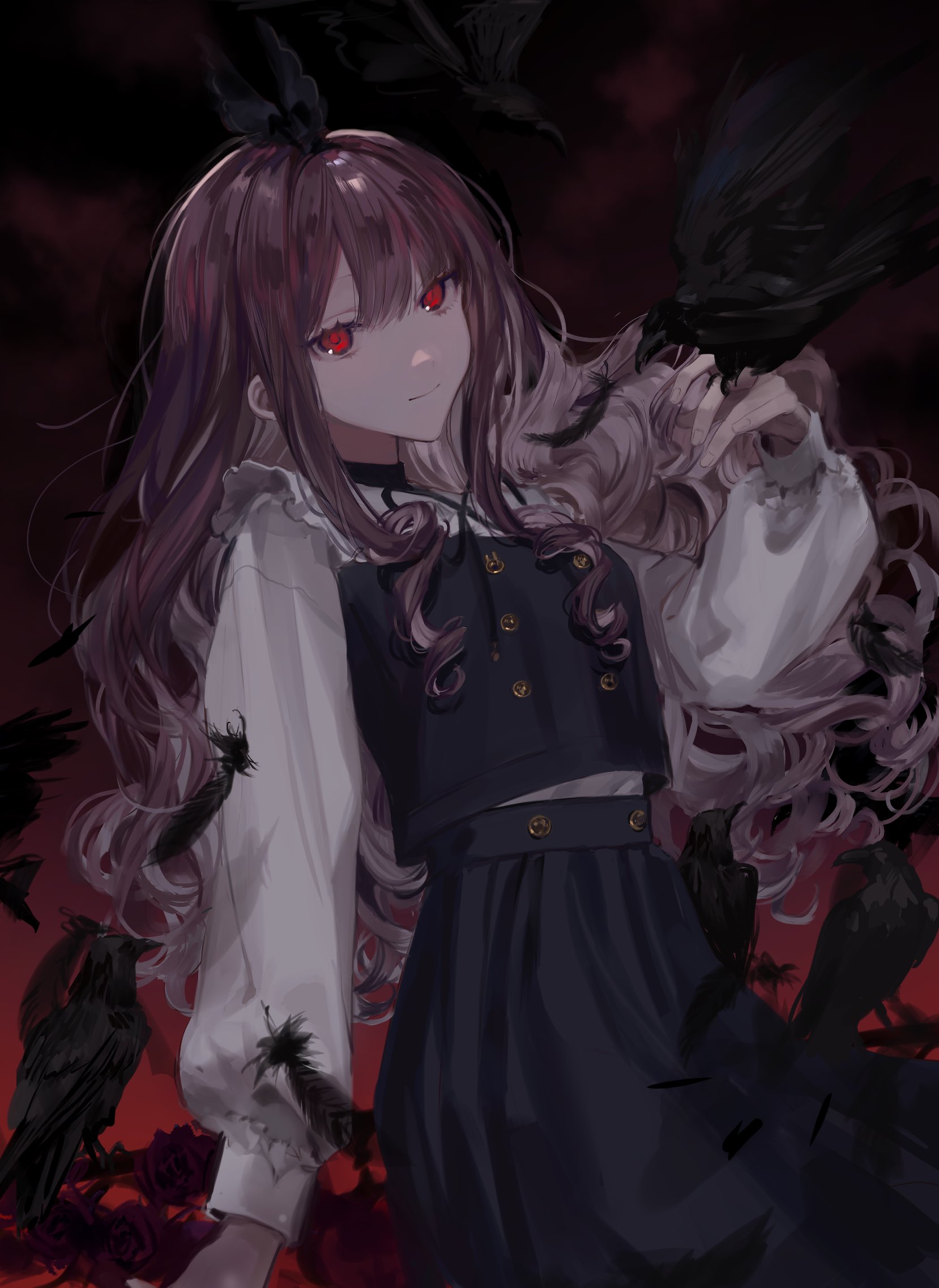 1girl apron bird bird_on_hand black_apron black_bow black_ribbon black_skirt bow brown_hair cloud crow curly_hair dark_background feathers floating_hair flower frills gold_buttons gradient_hair grey_hair headband highres light_smile long_hair long_skirt looking_at_viewer multicolored_hair neck_ribbon original pleated_skirt puffy_sleeves rabbit_ornament red_eyes red_flower red_rose ribbon rose senri_(rnd_024) shirt skirt sky sleeve_cuffs solo white_shirt
