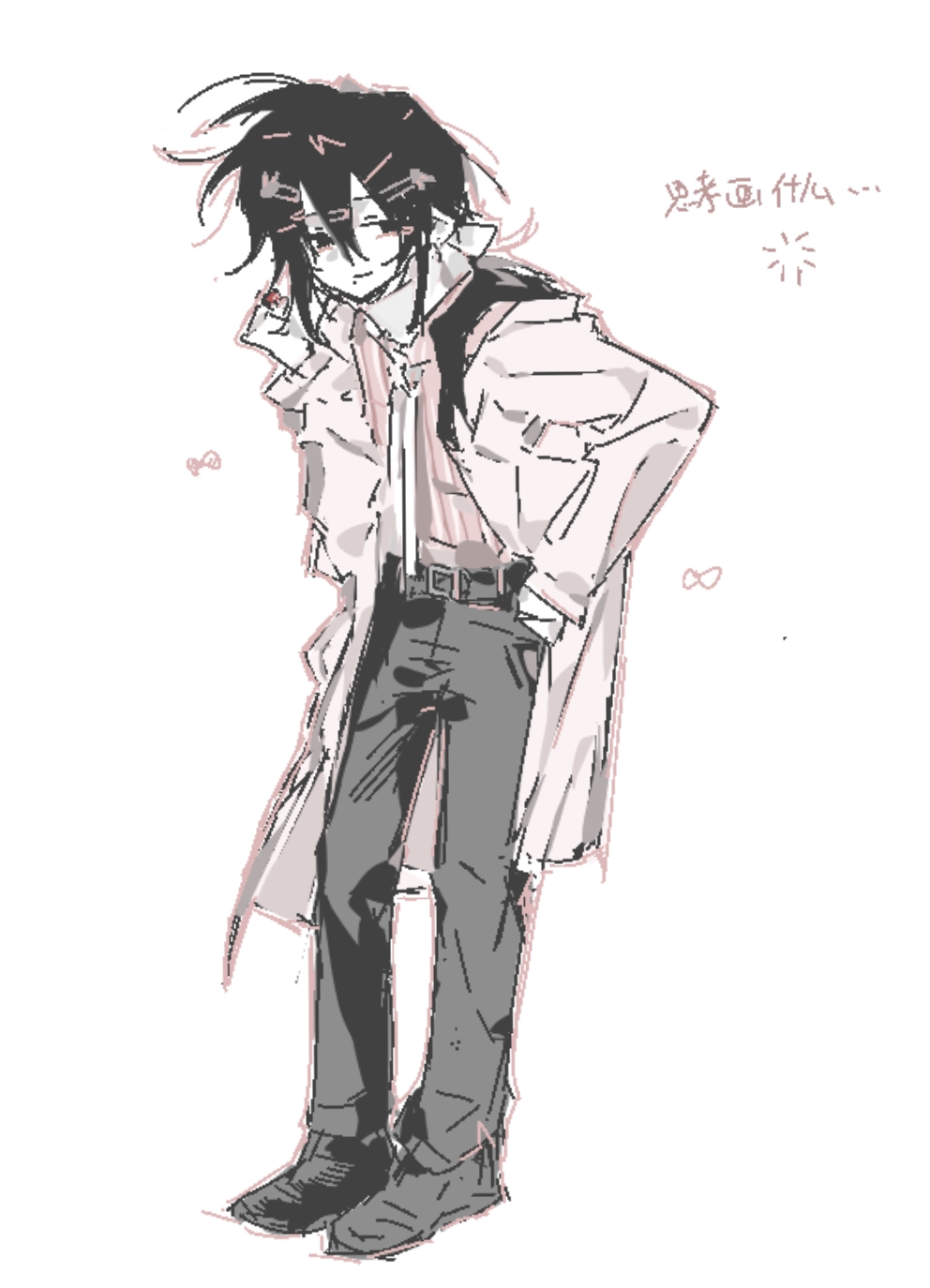 1boy black_bow black_eyes black_hair black_pants black_shoes bow chinese_commentary chinese_text closed_mouth colored_skin commentary_request full_body hair_between_eyes hair_ornament hair_ribbon hairclip hand_in_pocket hand_up highres lab_coat long_hair male_focus mo_chengwei necktie open_clothes pants pink_shirt qiufu_1.0 rabbit_hair_ornament ribbon shirt shoes simple_background smile solo striped_clothes striped_shirt touqi_guaitan translation_request vertical-striped_clothes vertical-striped_shirt white_background white_necktie white_ribbon white_skin