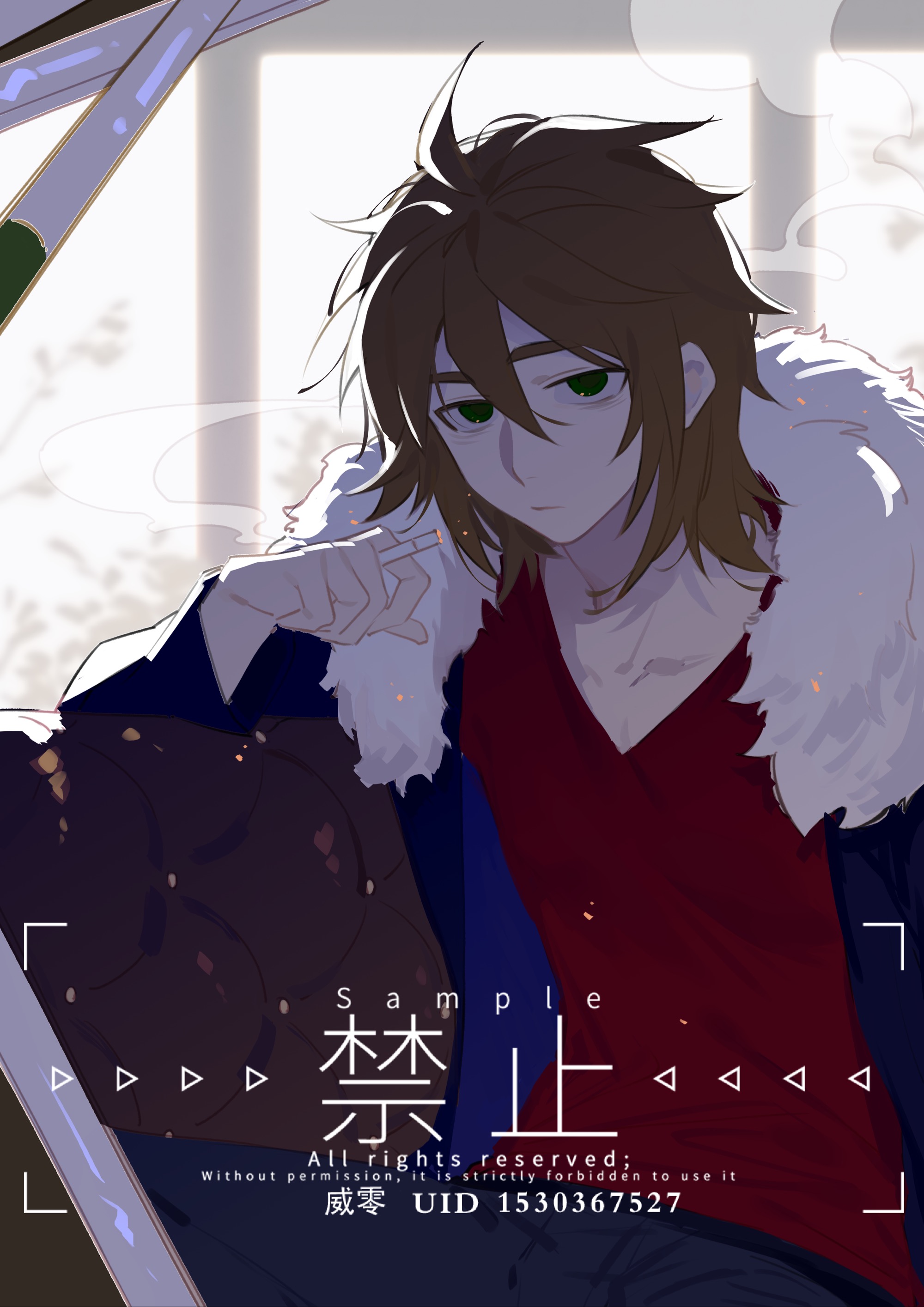 1boy absurdres black_pants blue_jacket brown_hair chinese_commentary cigarette closed_mouth commentary_request commission fur-trimmed_jacket fur_trim green_eyes hair_between_eyes highres holding holding_cigarette isoi_reiji jacket long_sleeves male_focus medium_hair open_clothes open_jacket pants red_shirt saibou_shinkyoku sanpaku shirt sitting smoke solo v-neck v0veiling watermark