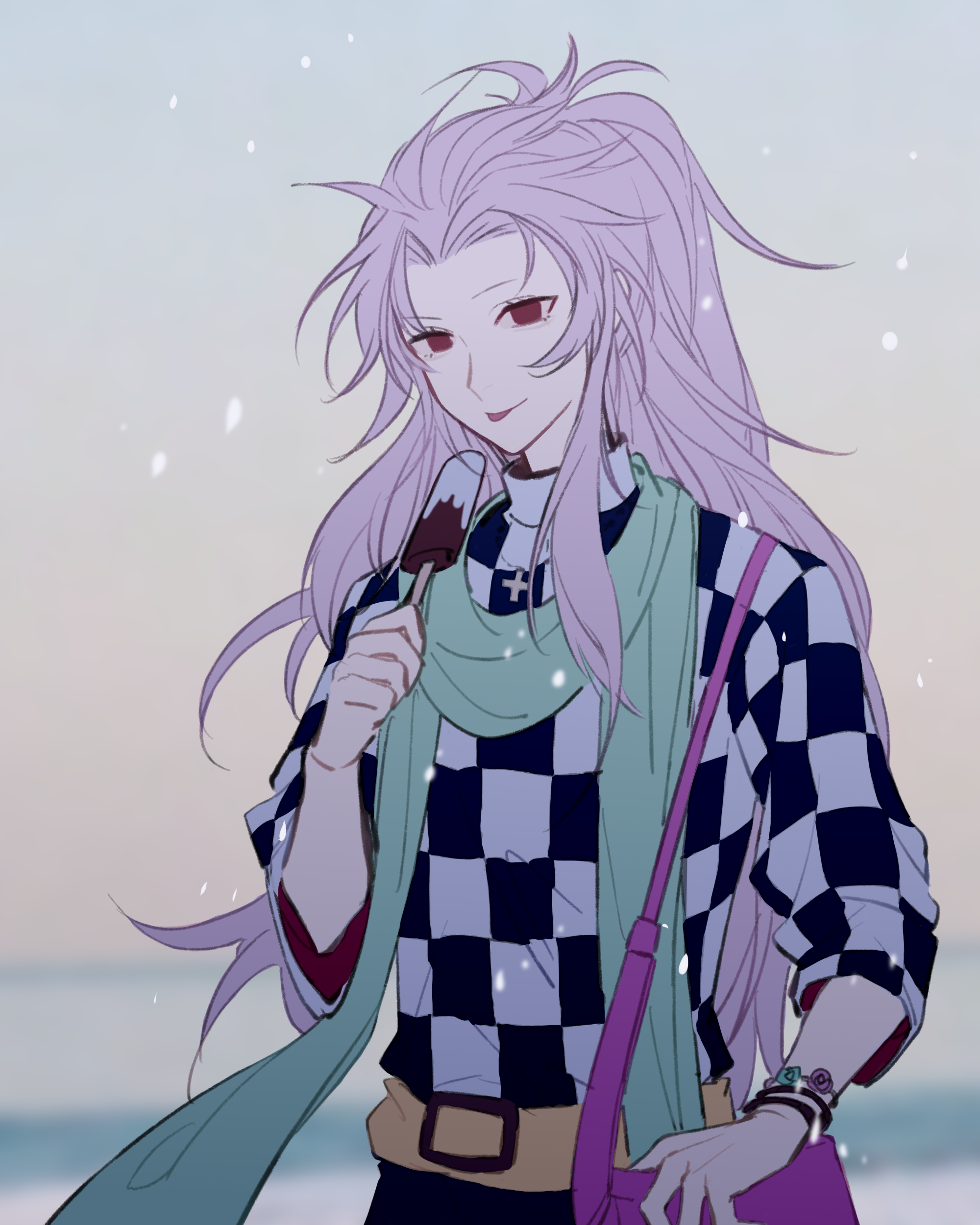 1boy absurdres bag belt bracelet checkered_clothes checkered_shirt chinese_commentary commentary_request cowboy_shot cross cross_necklace food fudgesicle green_scarf hatsutori_hajime highres holding holding_food jewelry long_hair long_sleeves male_focus necklace official_alternate_costume parted_bangs pink_bag pink_hair red_eyes saibou_shinkyoku scarf shirt shoulder_bag smile solo tongue tongue_out upper_body v0veiling yellow_belt
