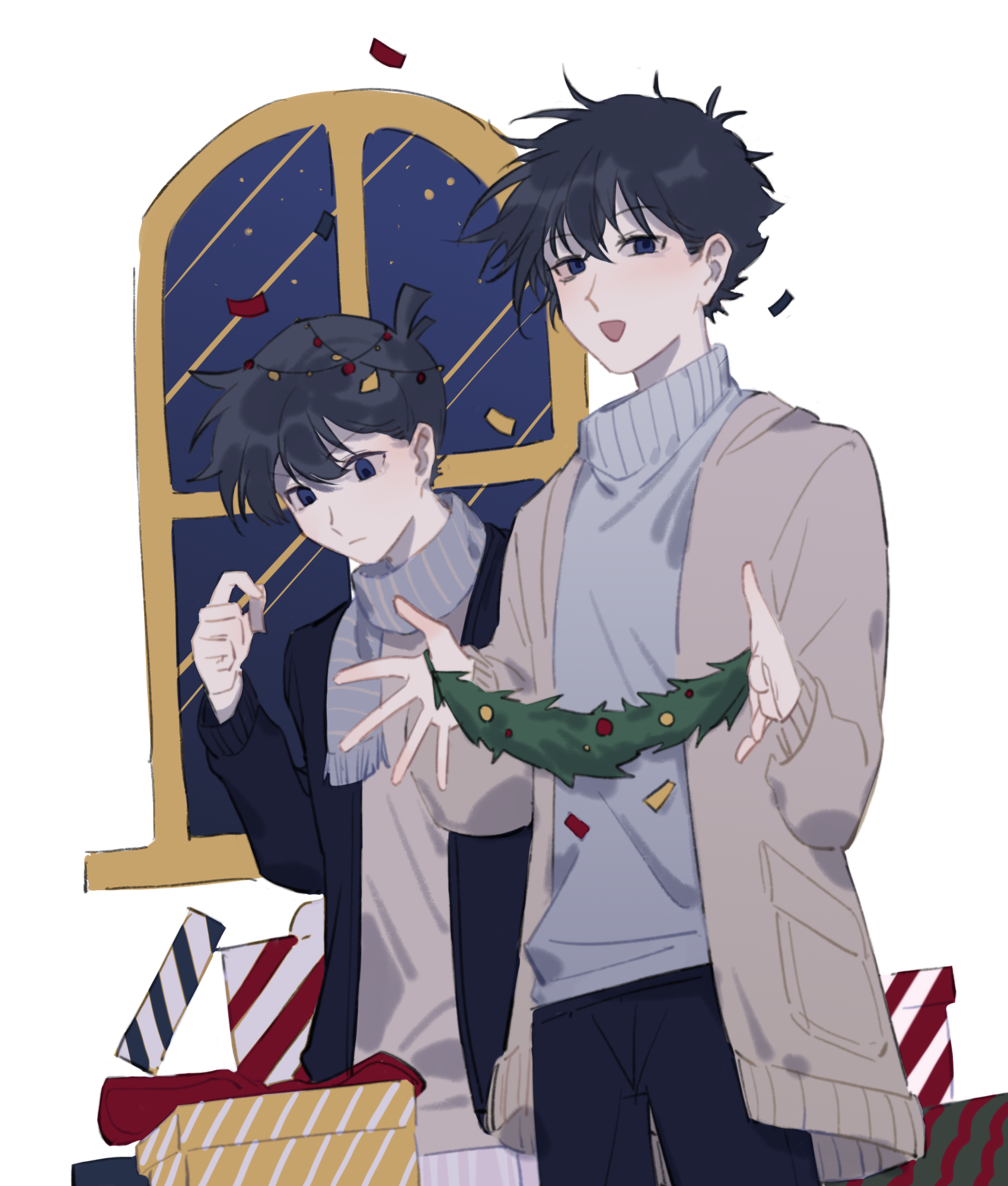 2boys black_hair black_jacket black_pants blue_eyes brown_jacket brown_shirt chinese_commentary christmas closed_mouth commentary_request gift highres jacket kudou_shin'ichi kuroba_kaito long_sleeves male_focus meitantei_conan multiple_boys open_clothes open_jacket open_mouth pants shirt short_hair smile sweater turtleneck turtleneck_sweater v0veiling white_sweater