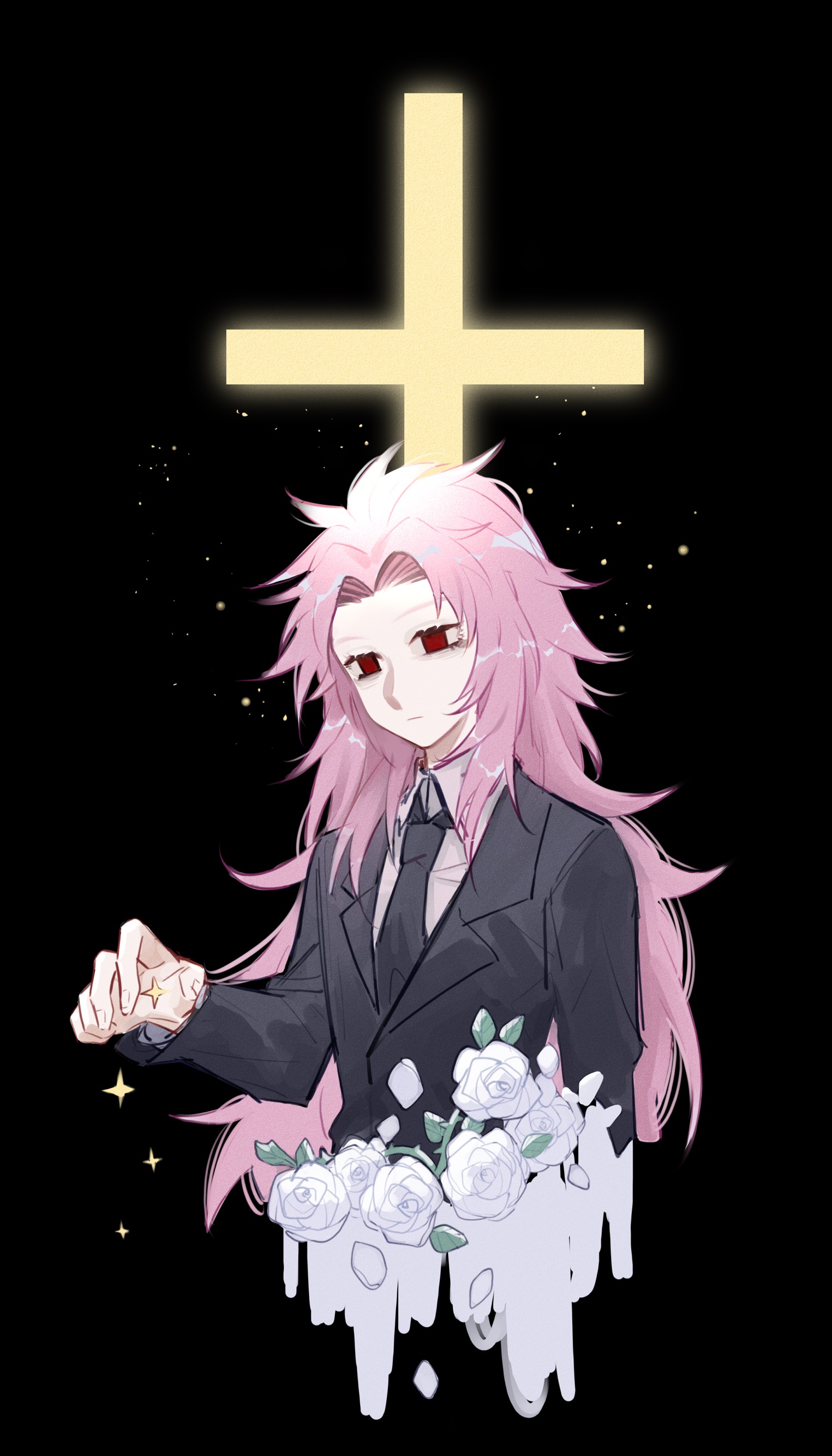 1boy absurdres black_background black_jacket black_necktie chinese_commentary closed_mouth collared_shirt commentary_request cropped_torso cross expressionless flower hatsutori_hajime highres jacket long_hair long_sleeves male_focus necktie parted_bangs pink_hair red_eyes rose saibou_shinkyoku shirt solo v0veiling white_flower white_rose white_shirt