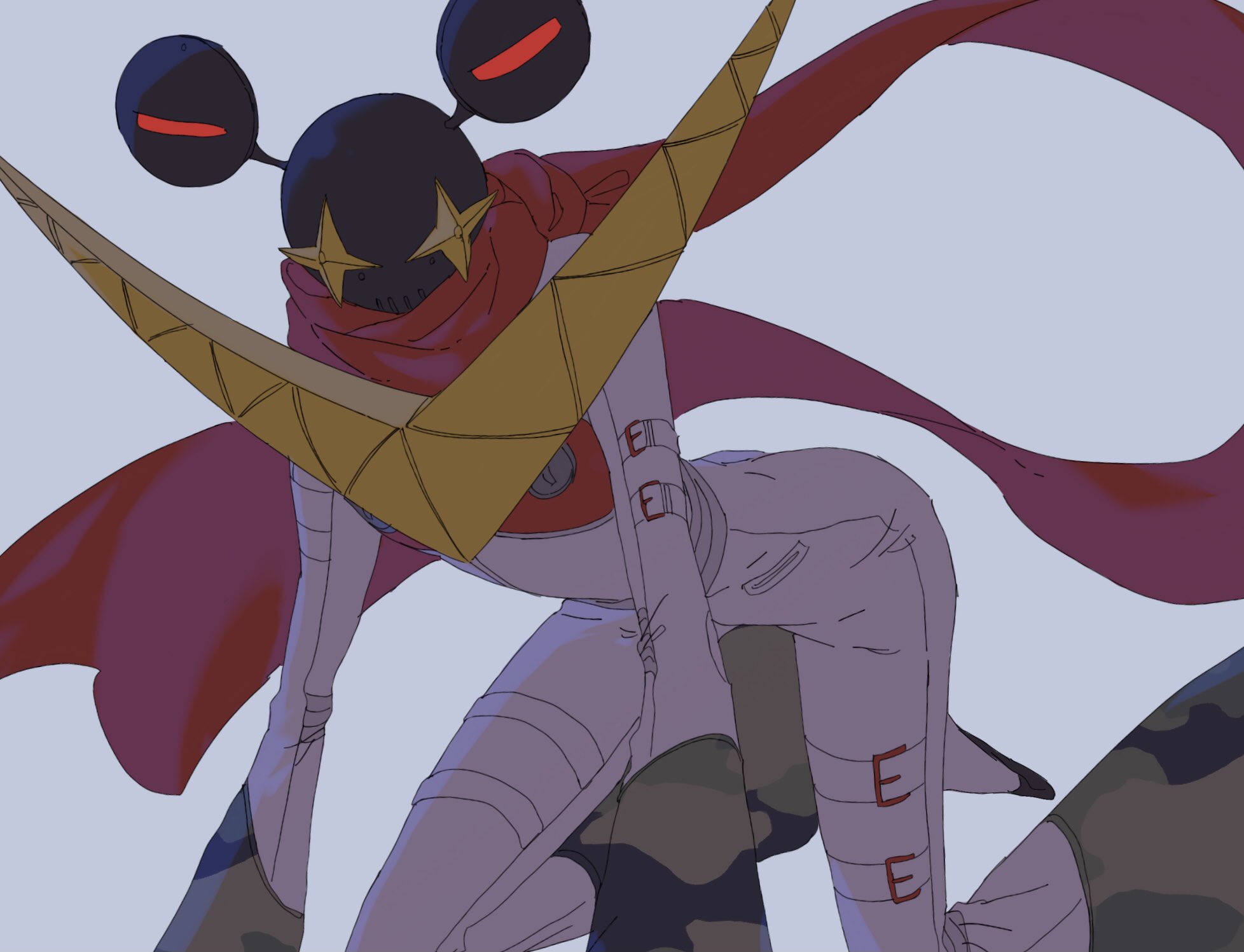 1other ainame_(engel571) all_fours arched_back arm_belt belt belt_buckle black_skin buckle camouflage_footwear camouflage_gloves colored_skin commentary foot_out_of_frame gloves highres jiraiya_(persona_4) jumpsuit long_scarf multiple_belts persona persona_4 red_scarf scarf simple_background solo thigh_belt thigh_strap white_background white_belt white_jumpsuit