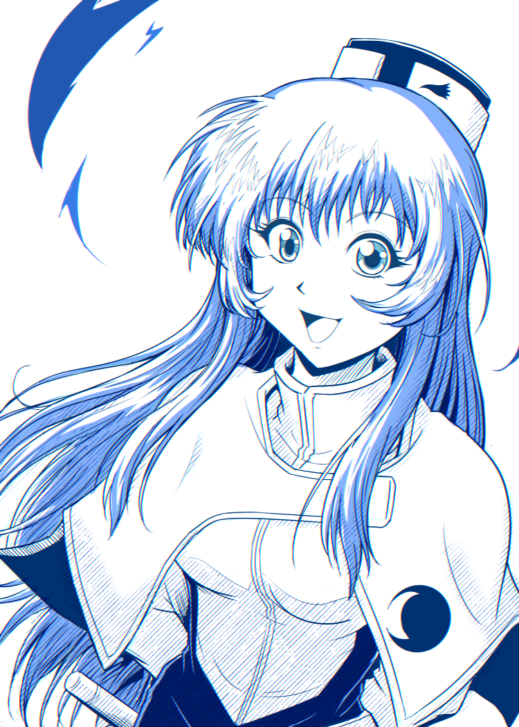 1girl arm_behind_back blue_theme capelet commentary_request eyelashes hat jacket kidou_senkan_nadesico long_hair looking_at_viewer mamiya_myanmar misumaru_yurika monochrome open_mouth simple_background solo upper_body very_long_hair white_background