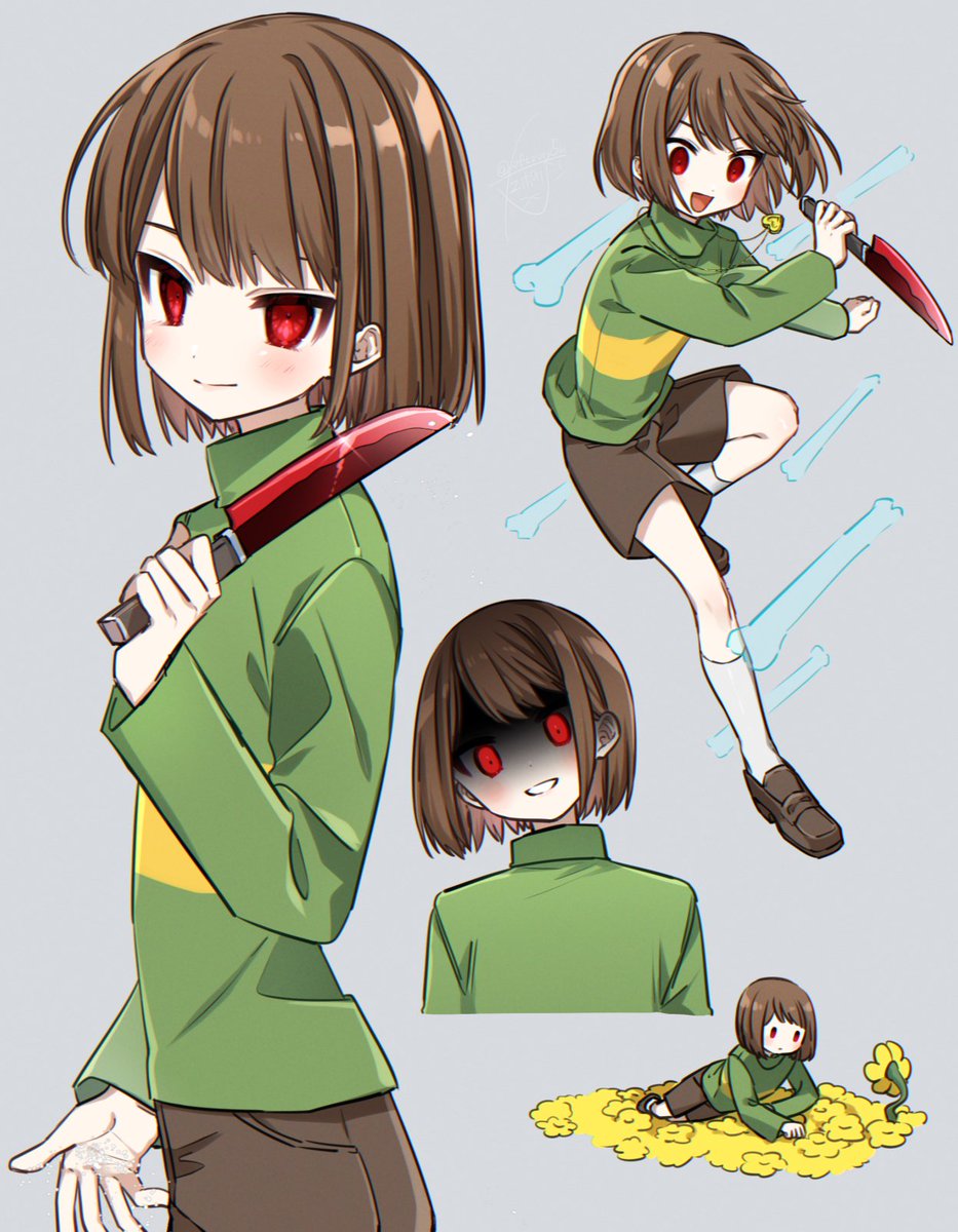1other :d blush bob_cut bone brown_footwear brown_hair brown_shorts chara_(undertale) closed_mouth cowboy_shot cropped_torso dust dynamic_pose field flower flower_field flowey_(undertale) full_body green_sweater grey_background grin head_tilt heart heart_necklace highres holding holding_knife jewelry kneehighs knife leftporygon loafers long_sleeves looking_at_viewer multiple_views necklace open_mouth other_focus red_eyes shaded_face shoes short_hair shorts simple_background smile socks standing standing_on_one_leg striped_clothes striped_sweater sweater tongue turtleneck turtleneck_sweater two-tone_sweater undertale utdr_(toby_fox) white_socks yellow_flower
