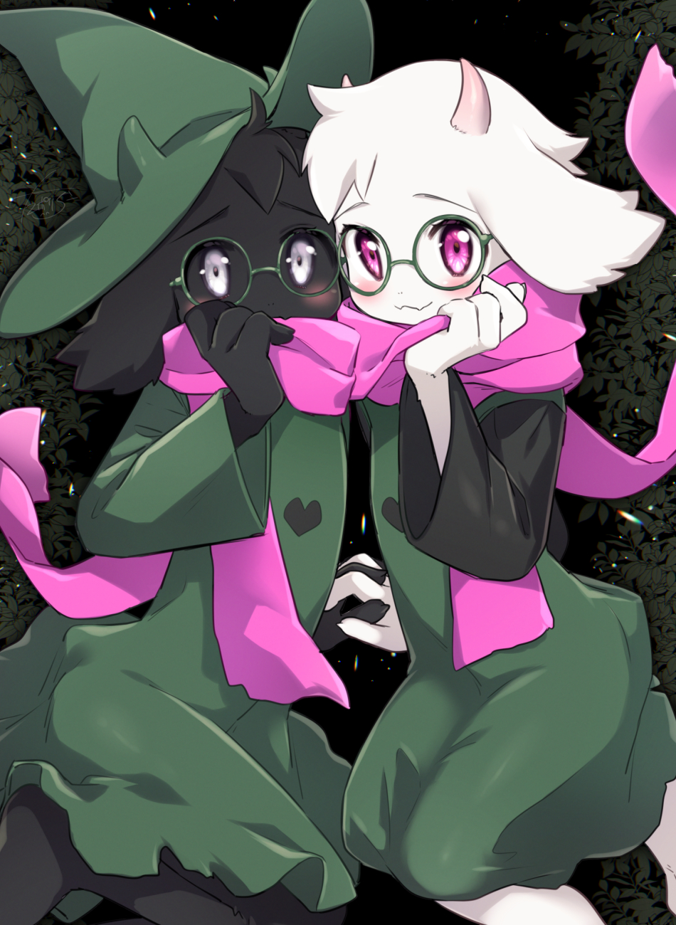 2boys black_background black_fur blush closed_mouth commentary_request covering_own_mouth deltarune dual_persona fewer_digits furry furry_male glasses green-framed_eyewear green_hat green_robe hand_up hat highres holding_hands horns leaf leftporygon long_sleeves looking_at_viewer multiple_boys no_sclera pink_eyes pink_horns pink_scarf ralsei ralsei_(hat) robe round_eyewear scarf simple_background standing standing_on_one_leg utdr_(toby_fox) white_eyes white_fur witch_hat