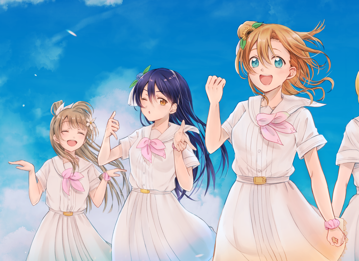 4girls :d ;o \n/ ^_^ a_song_for_you!_you?_you!! ayase_eli blue_eyes blue_flower blue_hair blue_sky bow bowtie breasts brown_eyes clenched_hand closed_eyes cloud commentary_request cowboy_shot cropped dark_blue_hair dress facing_viewer finger_gun flower gradient_clothes gradient_dress grey_hair hair_flower hair_ornament hands_up kosaka_honoka long_hair looking_at_viewer love_live! love_live!_school_idol_project medium_breasts minami_kotori multiple_girls official_alternate_costume one_eye_closed one_side_up open_mouth orange_hair out_of_frame pink_bow pink_bowtie pink_scrunchie pleated_dress sailor_collar sailor_dress scrunchie shaka_sign short_sleeves sky smile sonoda_umi suito sunflower teeth upper_teeth_only white_dress white_flower white_sailor_collar wrist_scrunchie yellow_flower