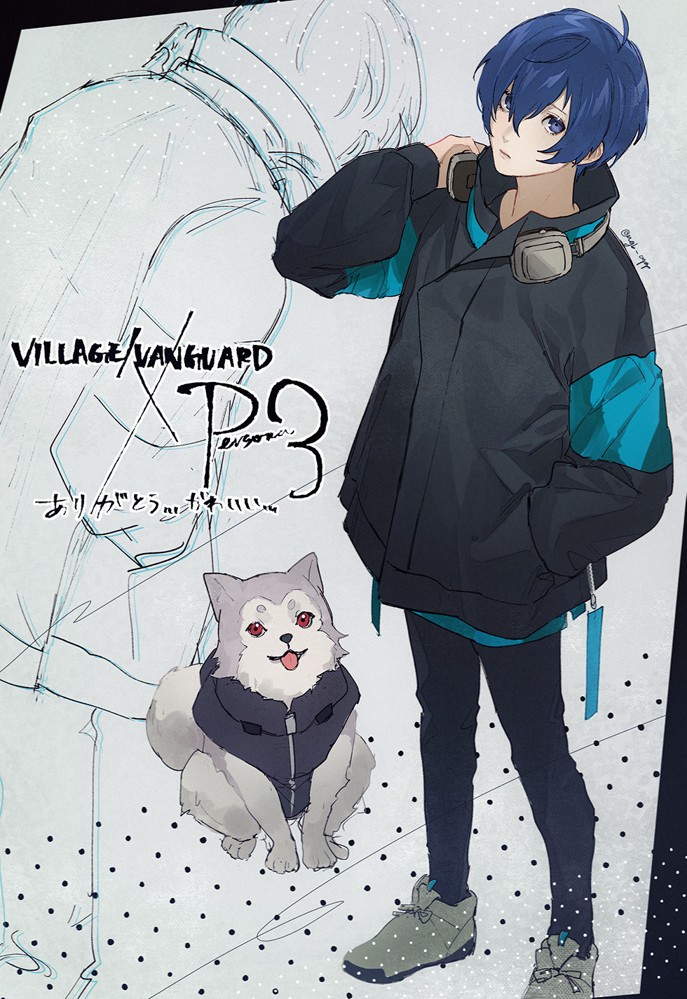 1boy animal artist_name black_jacket black_pants blue_eyes blue_hair closed_mouth clothed_animal dog expressionless full_body hair_between_eyes hand_in_pocket hand_on_headphones hand_up headphones headphones_around_neck highres jacket kaori koromaru_(persona) long_sleeves looking_at_viewer looking_up male_focus official_alternate_costume pants persona persona_3 red_eyes short_hair simple_background sitting sketch_background standing twitter_username village_vanguard yuuki_makoto_(persona_3) zipper_pull_tab