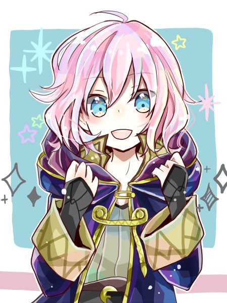 1girl ahoge blue_eyes coat fire_emblem fire_emblem_awakening hood hooded_coat female_morgan_(fire_emblem) nintendo open_mouth pink_hair simple_background smile solo star_(symbol) yuyu_(spika)