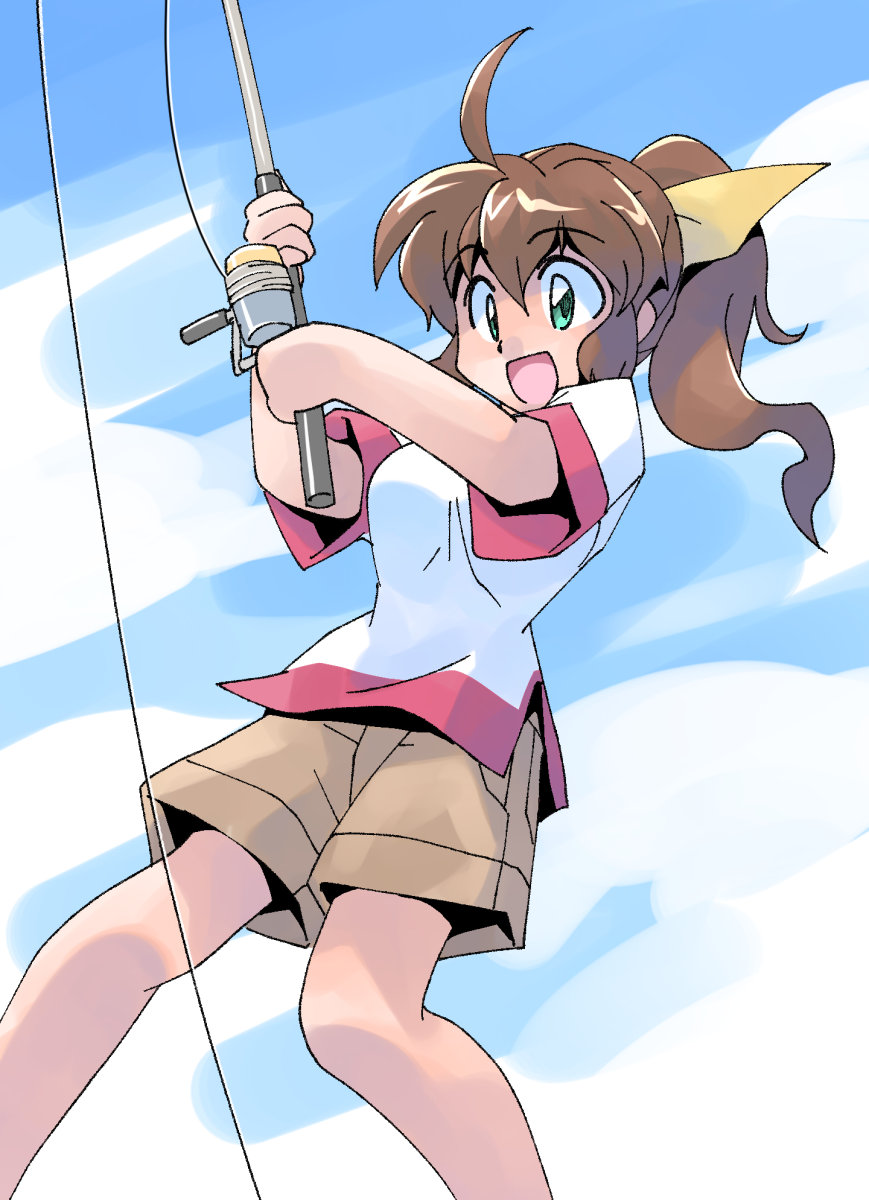 1girl ahoge blue_sky bow brown_hair close-up cloud cloudy_sky cowboy_shot day fishing fishing_rod green_eyes hair_bow hair_ornament highres holding holding_fishing_rod long_hair masuki open_mouth original outdoors ponytail shirt shorts simple_background sketch_background sky solo white_shirt wide_sleeves yellow_bow