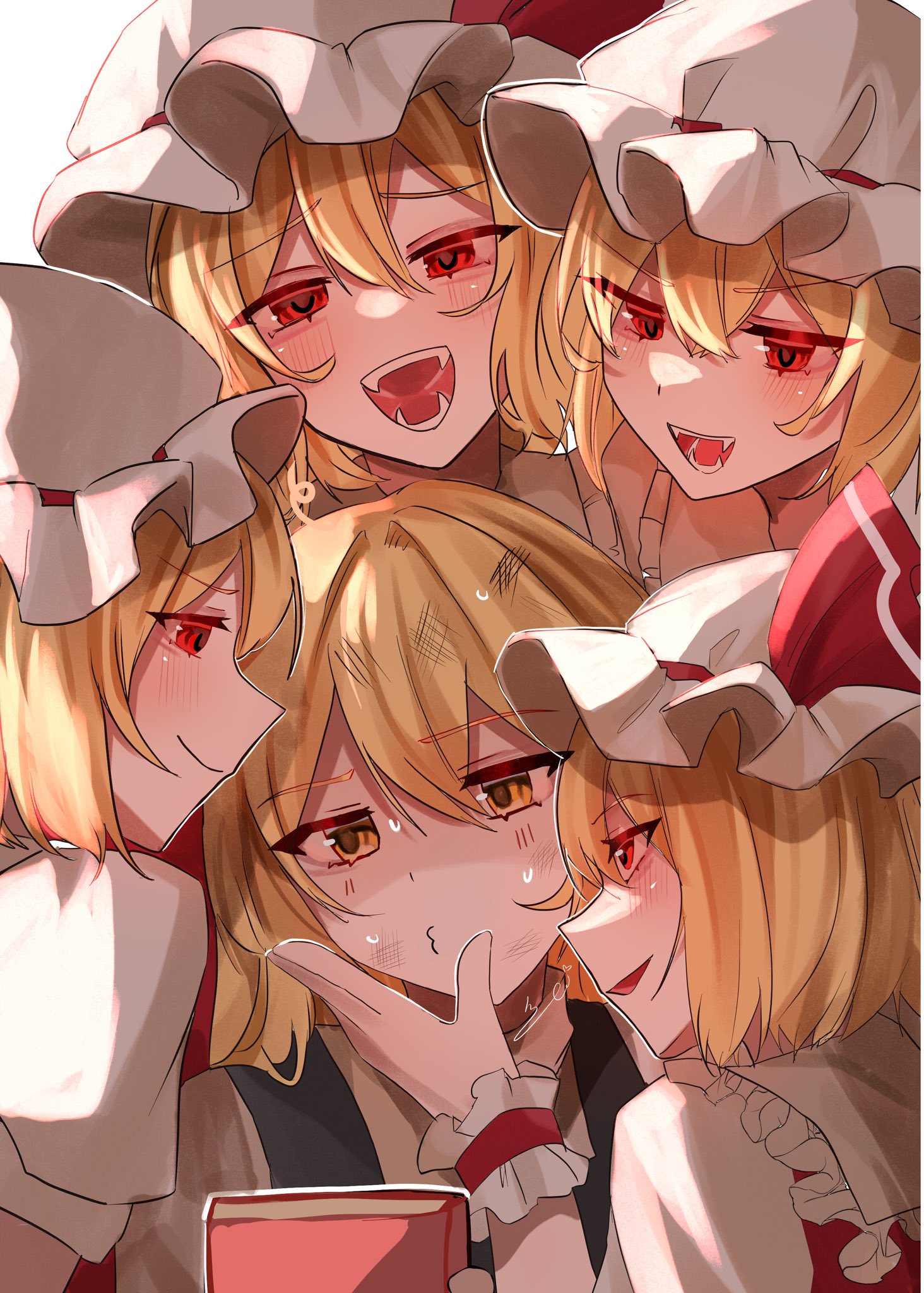 5girls :3 blonde_hair closed_mouth dress fangs flandre_scarlet four_of_a_kind_(touhou) frilled_dress frills hat hat_ribbon highres izumi_no_yasushi_aya kirisame_marisa multiple_girls open_mouth red_eyes red_ribbon ribbon short_hair smile sweat teeth touhou upper_body upper_teeth_only white_hat wrist_cuffs yellow_eyes