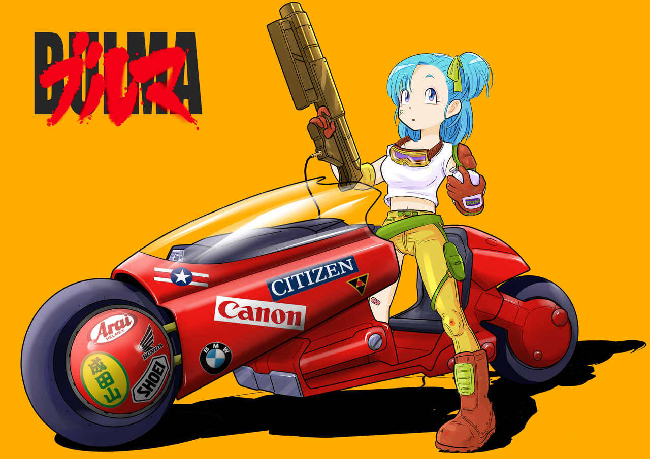 1girl akira_(manga) aqua_hair armor asymmetrical_hair bandaid bandaid_on_cheek bandaid_on_face belt blue_eyes boots brand_name_imitation breasts brown_boots brown_gloves bulma character_name commentary_request crop_top dragon_ball dragon_ball_(classic) dragon_radar energy_gun finger_on_trigger full_body gloves goggles goggles_around_neck green_belt green_ribbon gun hair_ribbon holding holding_gun holding_weapon kaneda_shoutarou's_bike laser_rifle leather leather_gloves medium_breasts medium_hair midriff motor_vehicle motorcycle on_motorcycle one_side_up orange_background pants pauldrons pouch product_placement purple-tinted_eyewear ribbon scene_reference shirt shoulder_armor single_pauldron solo t-shirt thigh_pouch tinted_eyewear weapon yellow_pants yuichi_ishikawa