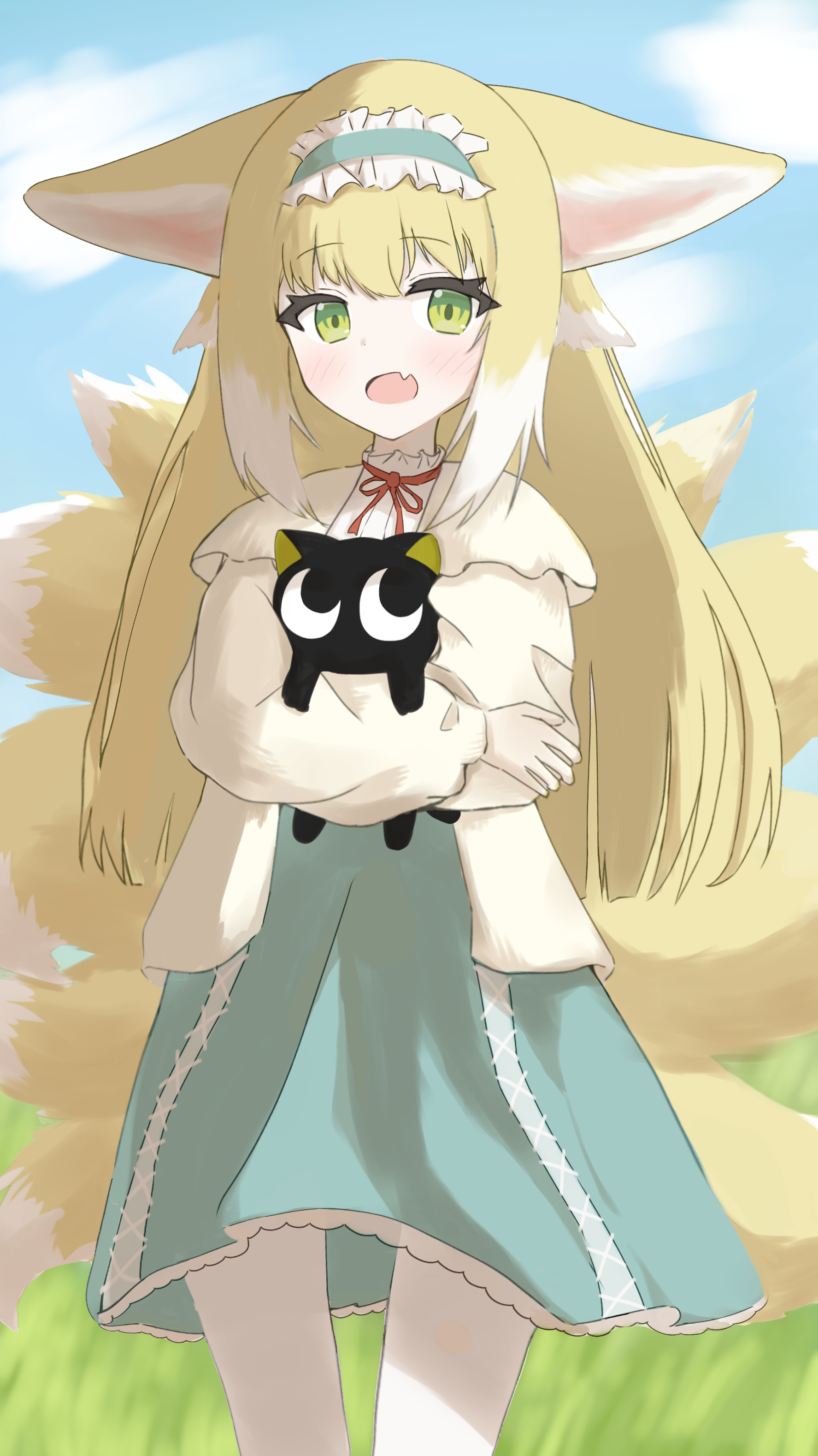 1girl :d absurdres arknights blonde_hair blush cardigan commentary cowboy_shot crossed_arms day fang frilled_hairband frilled_skirt frills green_eyes green_hairband green_skirt hairband highres holding long_hair long_sleeves luo_xiaohei luo_xiaohei_(cat) luo_xiaohei_zhanji multicolored_hair multiple_tails neck_ribbon official_alternate_costume open_mouth outdoors p3pp3r_pic pantyhose red_ribbon ribbon sketch skin_fang skirt smile solo split_mouth standing streaked_hair suzuran_(arknights) suzuran_(spring_praise)_(arknights) tail white_cardigan white_hair white_pantyhose white_tail yellow_tail