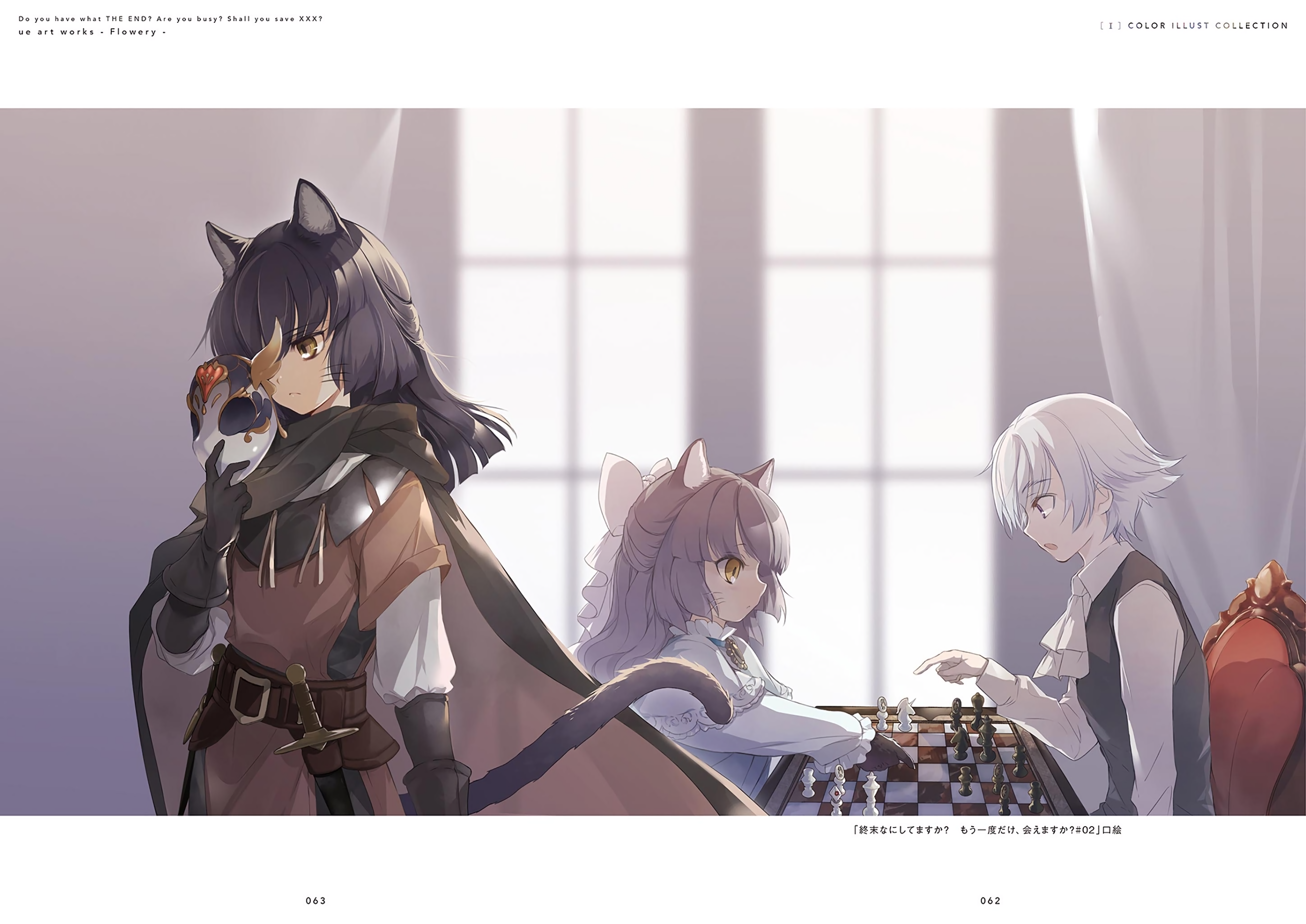 1boy 2girls absurdres animal_ears ascot black_cape black_gloves black_hair black_vest blurry blurry_background brown_jacket cape cat_ears cat_girl cat_tail chessboard feodor_jessman floating_hair gloves highres holding holding_mask indoors jacket layered_sleeves long_hair long_sleeves marguerite_medicis mask multiple_girls official_art page_number playing_chess remembering sheath sheathed shirt short_hair short_over_long_sleeves short_sleeves shuumatsu_nani_shitemasu_ka? sitting standing sword tail third-party_source ue vest weapon white_ascot white_hair white_shirt