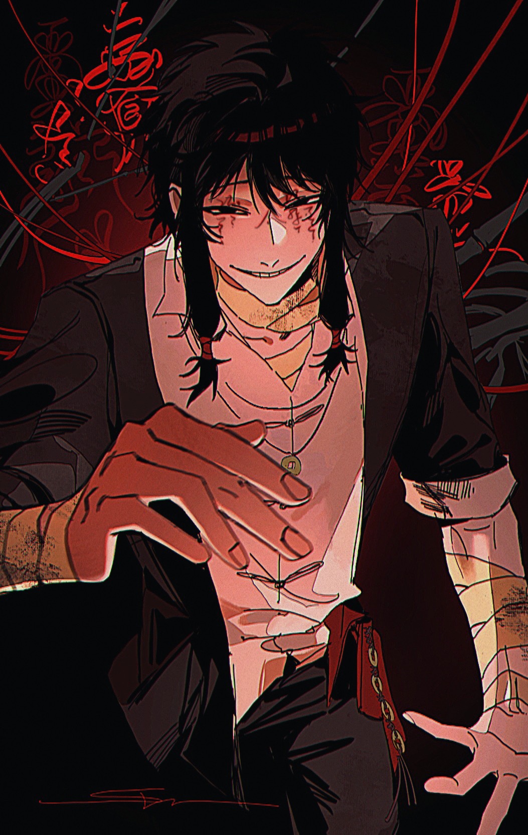 1boy bandaged_arm bandages black_eyes black_hair black_jacket black_pants chinese_commentary coin coin_on_string collared_shirt commentary_request facial_tattoo film_grain grin highres holed_coin jacket jewelry low-tied_sidelocks male_focus necklace open_clothes open_collar open_jacket pants shirt short_hair_with_long_locks sidelocks sleeves_rolled_up smile solo switzer tattoo touqi_guaitan white_shirt ziche_fuzhao