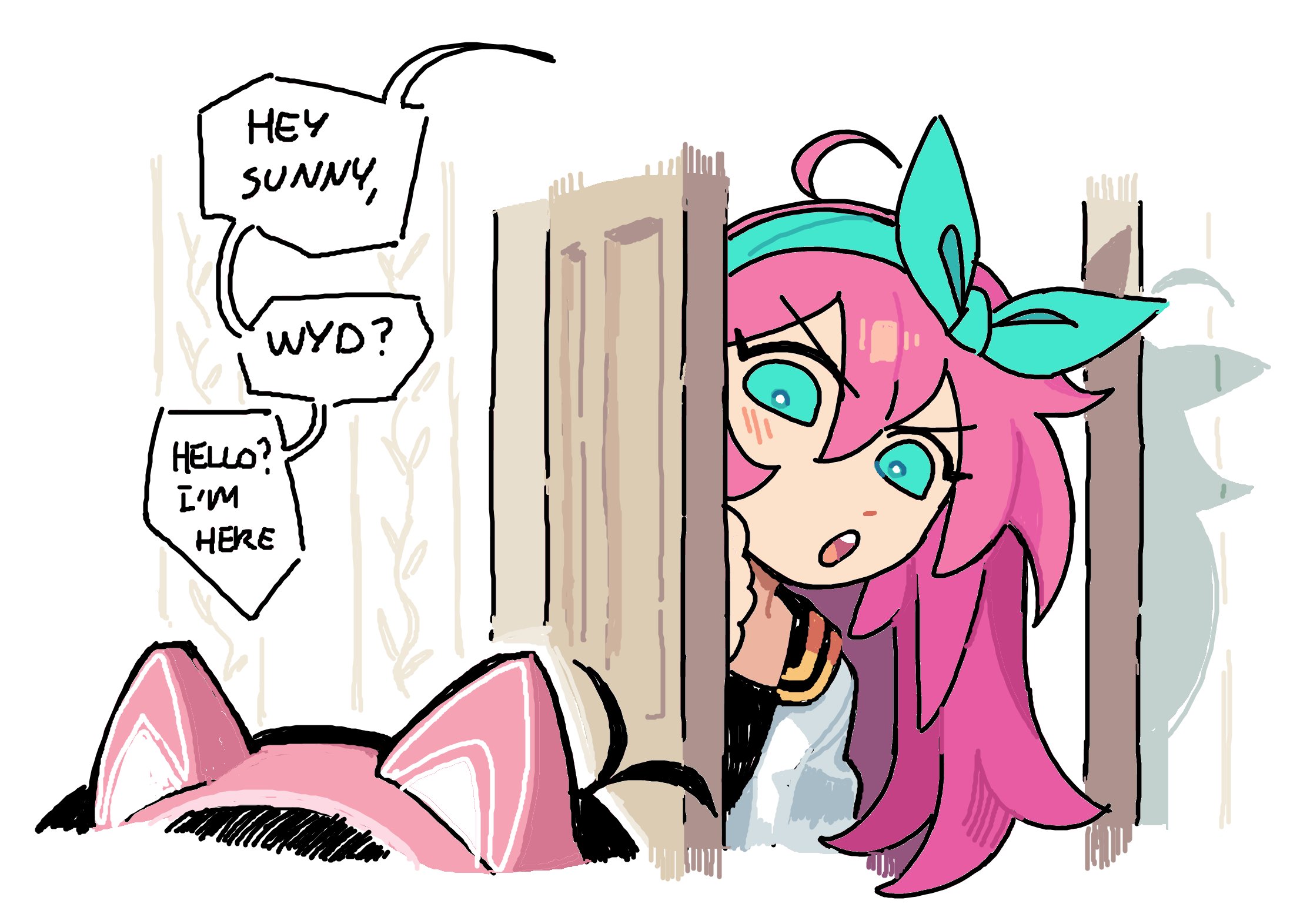 1boy 1girl ahoge animal_ear_headphones animal_ears antenna_hair aqua_eyes aqua_hairband aubrey_(faraway)_(omori) aubrey_(omori) black_hair black_sailor_collar black_shirt bow_hairband bright_pupils cat_ear_headphones cat_ears commentary commission deformed double-parted_bangs english_commentary english_text fake_animal_ears hair_between_eyes hairband hatching_(texture) headphones highres indoors jacket long_hair omori open_clothes open_door open_jacket open_mouth pink_hair remi_(mozzaremi) sailor_collar shirt speech_bubble sunny_(omori) teeth tongue upper_teeth_only white_jacket white_pupils