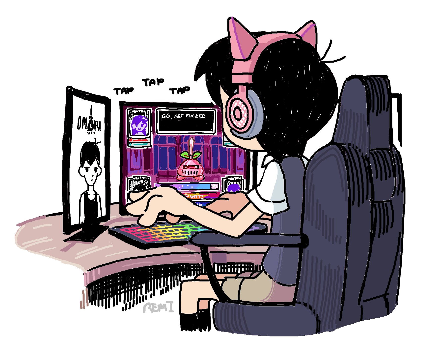 1boy animal_ear_headphones animal_ears antenna_hair artist_name aubrey_(headspace)_(omori) aubrey_(omori) black_hair black_socks brown_shorts cat_ear_headphones cat_ears chair commentary commission computer computer_keyboard cropped_legs defloration english_commentary english_text fake_animal_ears from_behind grey_sweater_vest hatching_(texture) headphones highres kneehighs male_focus monitor multiple_monitors office_chair omori omori_(omori) on_chair playing_games playing_video_games remi_(mozzaremi) shirt short_hair short_sleeves shorts simple_background sir_maximus_(omori) sitting socks solo sunny_(omori) sweater_vest swivel_chair table white_background white_shirt