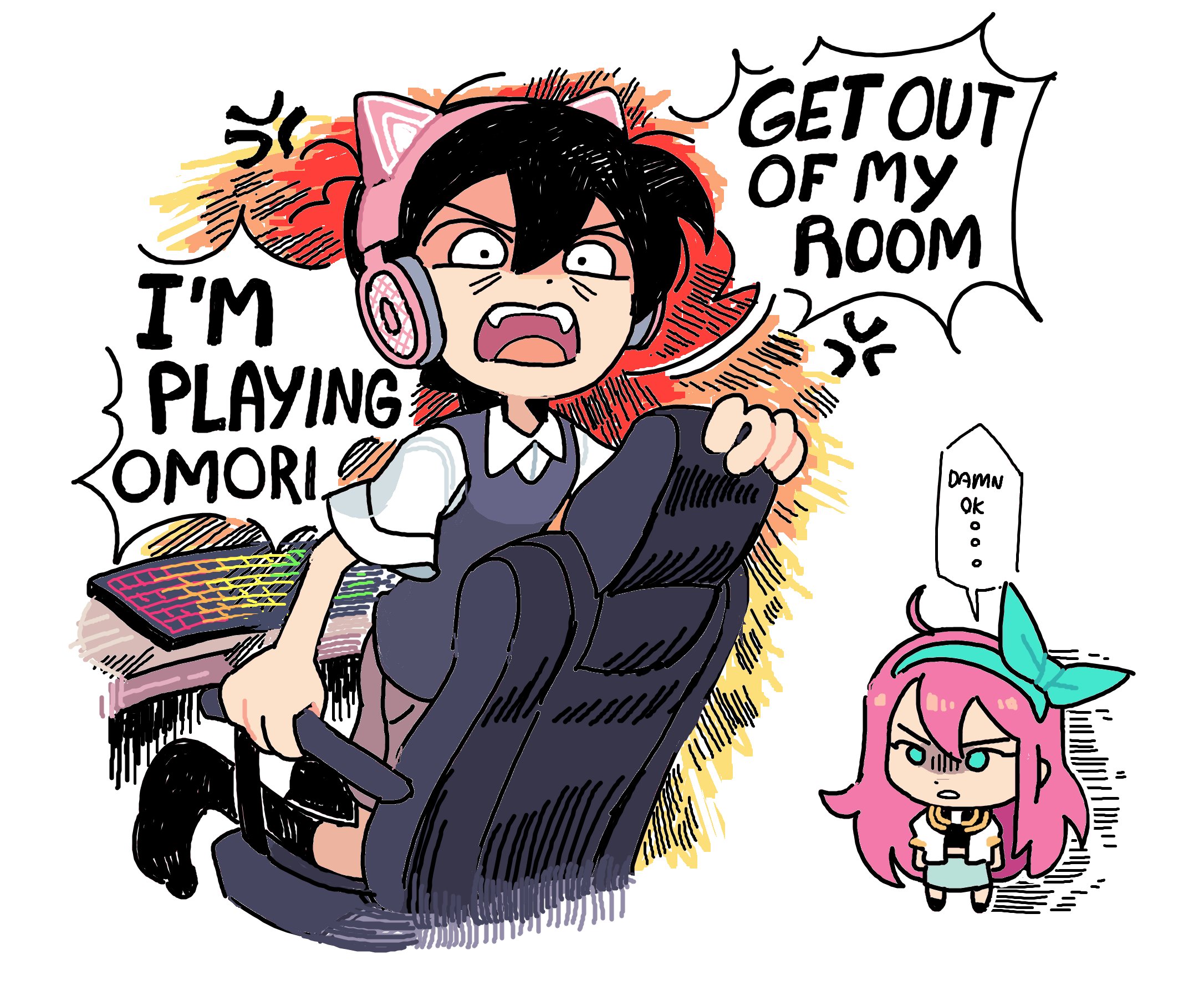 1boy 1girl ahoge anger_vein angry animal_ear_headphones animal_ears aqua_eyes aqua_hairband aubrey_(faraway)_(omori) aubrey_(omori) black_hair black_sailor_collar black_shirt black_socks bow_hairband brown_shorts cat_ear_headphones cat_ears chair chibi chibi_inset commentary commission computer_keyboard deformed double-parted_bangs english_commentary english_text fake_animal_ears full_body grey_sweater_vest hair_between_eyes hairband hatching_(texture) headphones highres jacket kneehighs kneeling long_hair no_sclera no_shoes office_chair official_alternate_eye_color omori on_chair open_clothes open_jacket open_mouth pink_hair remi_(mozzaremi) sailor_collar shirt short_hair short_sleeves shorts skirt socks speech_bubble sunny_(omori) sweater_vest swivel_chair table teeth tongue upper_teeth_only white_eyes white_jacket white_shirt