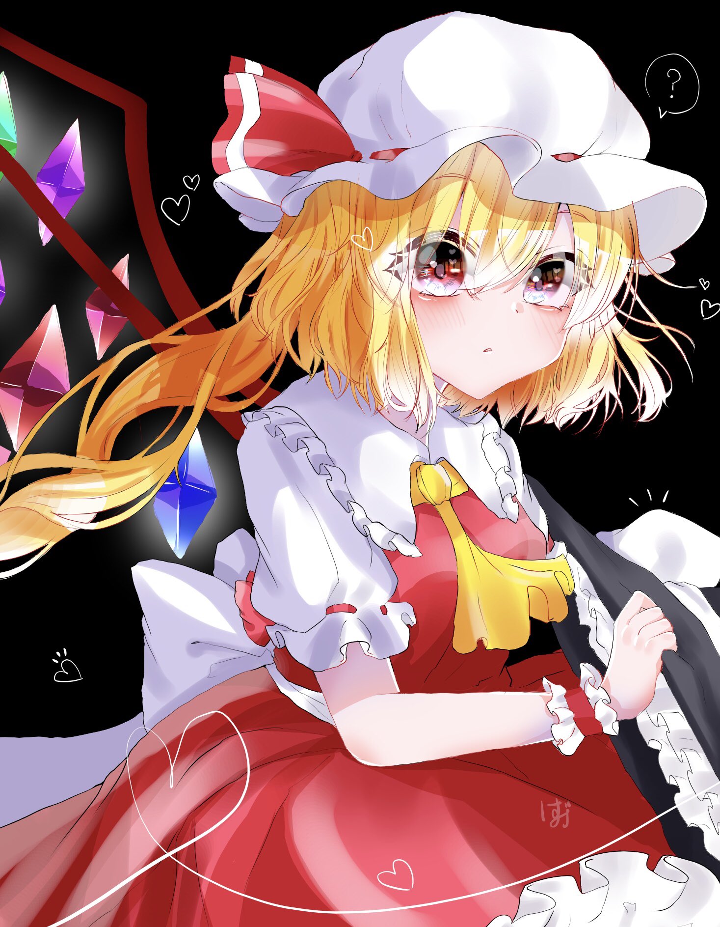 1girl ascot black_background blonde_hair cowboy_shot crystal_wings dress flandre_scarlet frilled_dress frills hat hat_ribbon heart highres izumi_no_yasushi_aya long_hair mob_cap parted_lips red_eyes red_ribbon ribbon simple_background solo touhou white_hat wings wrist_cuffs yellow_ascot