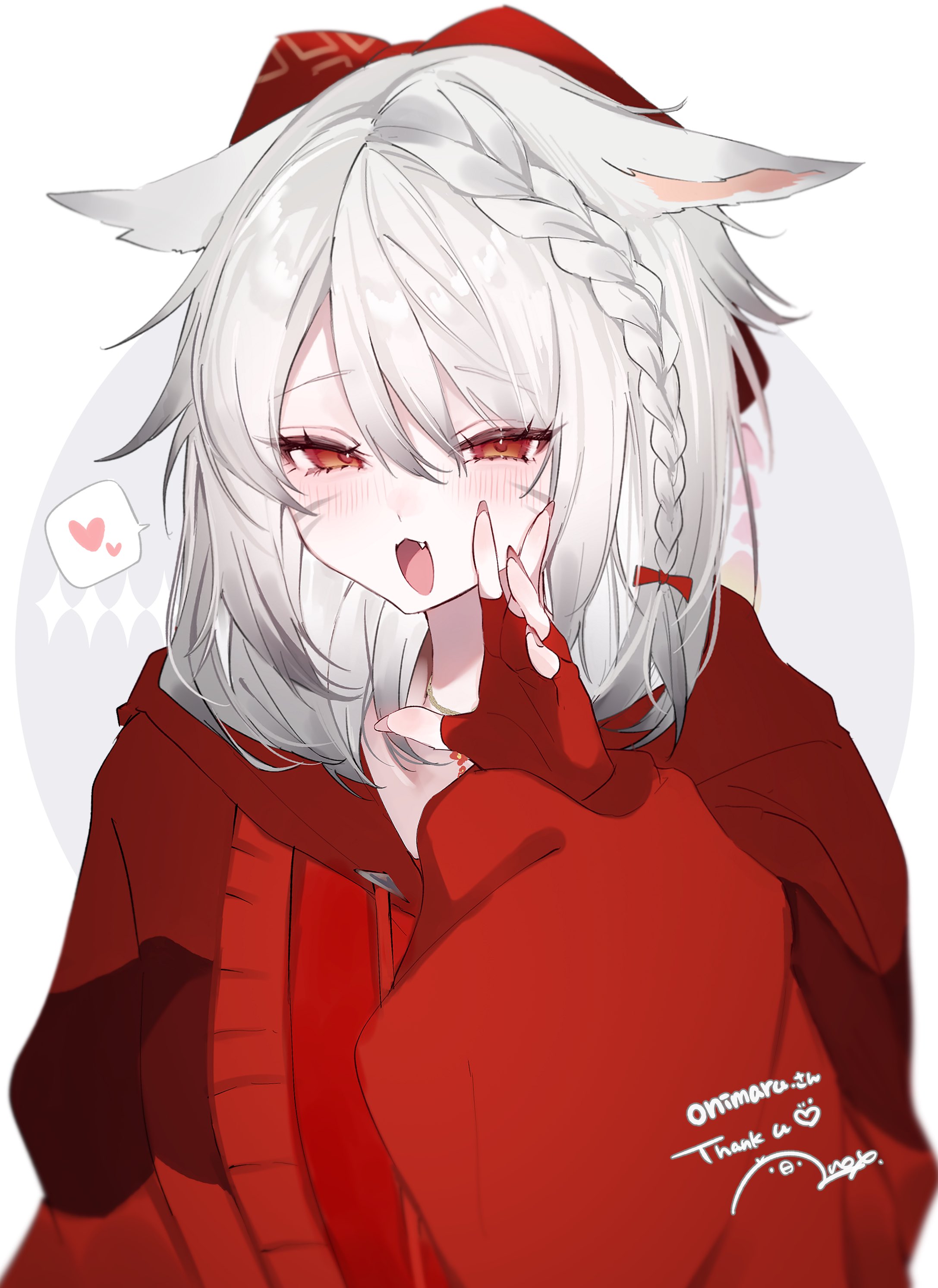 1girl absurdres animal_ears anoyo_(anoyode0) artist_name braid braided_sidelock cat_ears cat_girl commission commissioner_name facial_mark final_fantasy final_fantasy_xiv fingerless_gloves gloves grey_hair hair_ribbon heart highres hood hoodie jewelry medium_hair miqo'te necklace open_mouth red_eyes red_hoodie ribbon signature skeb_commission solo speech_bubble thank_you warrior_of_light_(ff14) whisker_markings