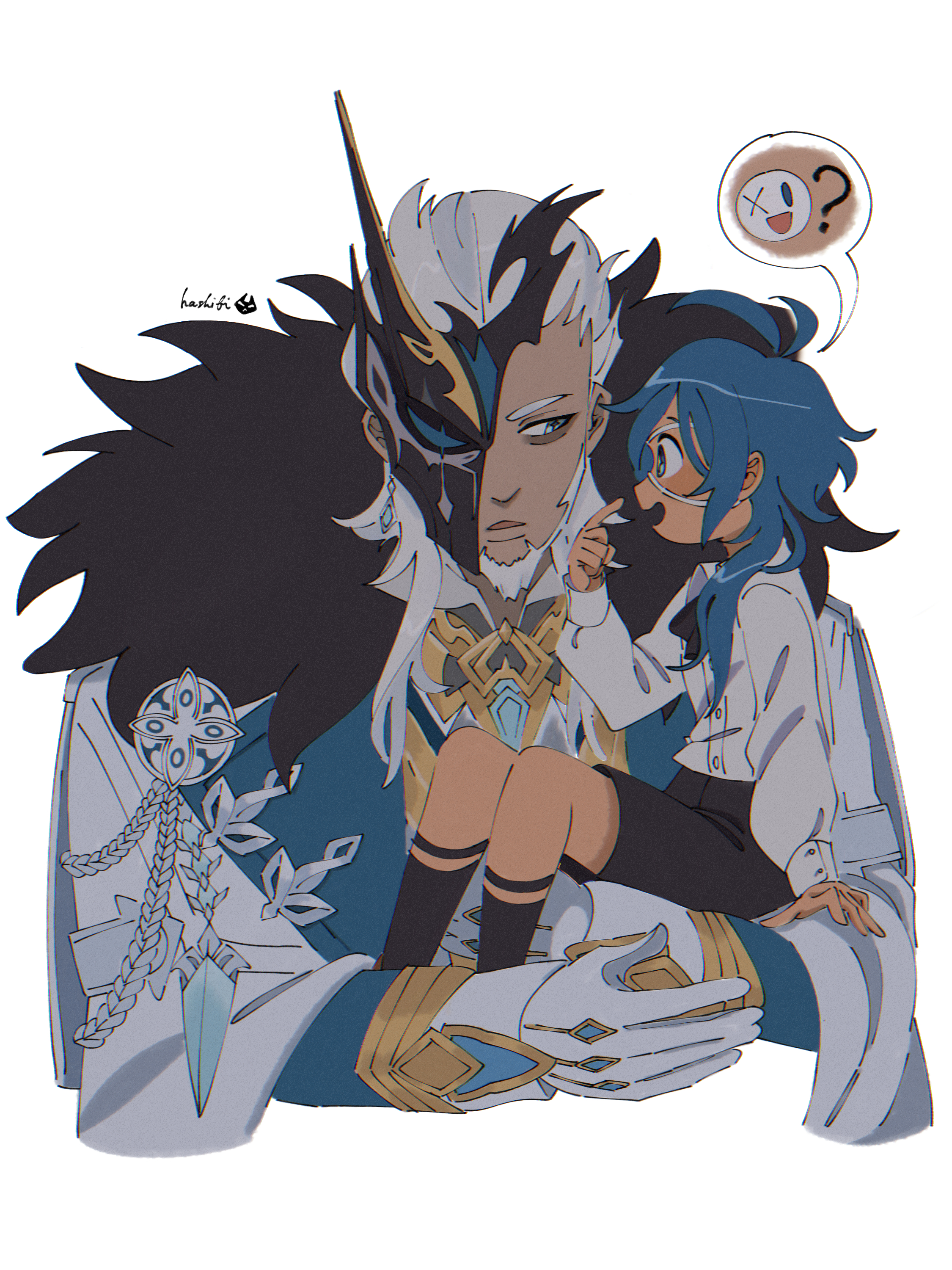 2boys ? absurdres age_difference artist_name black_shawl black_shorts black_socks blue_hair carrying carrying_person child coat cropped_torso dress_shirt facial_hair fatui_coat fur_shawl genshin_impact goatee hair_over_shoulder half_mask hashibi_(noyasakihashibi) high-waist_shorts highres image_in_speech_bubble kaeya_(genshin_impact) legwear_garter long_sleeves looking_at_another male_focus mask mature_male multiple_boys open_mouth pierro_(genshin_impact) pointing pointing_at_self shawl shirt shorts side_ponytail sideways_glance simple_background sitting sitting_on_arm socks star-shaped_pupils star_(symbol) symbol-shaped_pupils white_background white_coat white_hair white_shirt