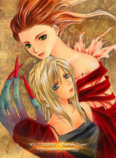 2girls artist_name aya_brea bad_id black_tank_top blonde_hair blue_eyes brown_background brown_hair claws commentary_request dress eve_(parasite_eve) expressionless green_eyes hair_slicked_back izumi_natsuka light_smile monster_girl multiple_girls off-shoulder_dress off_shoulder parasite_eve_(series) parasite_eve_i parted_lips red_dress red_nails tank_top torn_clothes torn_dress traditional_media upper_body