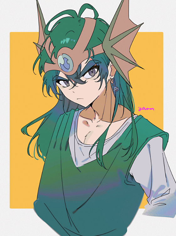 1boy :/ blue_gem border closed_mouth commentary cropped_arm cropped_torso dragon_quest dragon_quest_iv earrings fins gem gold_helmet green_hair green_tunic grey_eyes hair_between_eyes head_fins helmet hero_(dq4) jewelry layered_clothes long_hair long_sleeves looking_at_viewer male_focus shirt signature single_earring solo thick_eyebrows tunic undershirt white_border white_shirt yasaikakiage