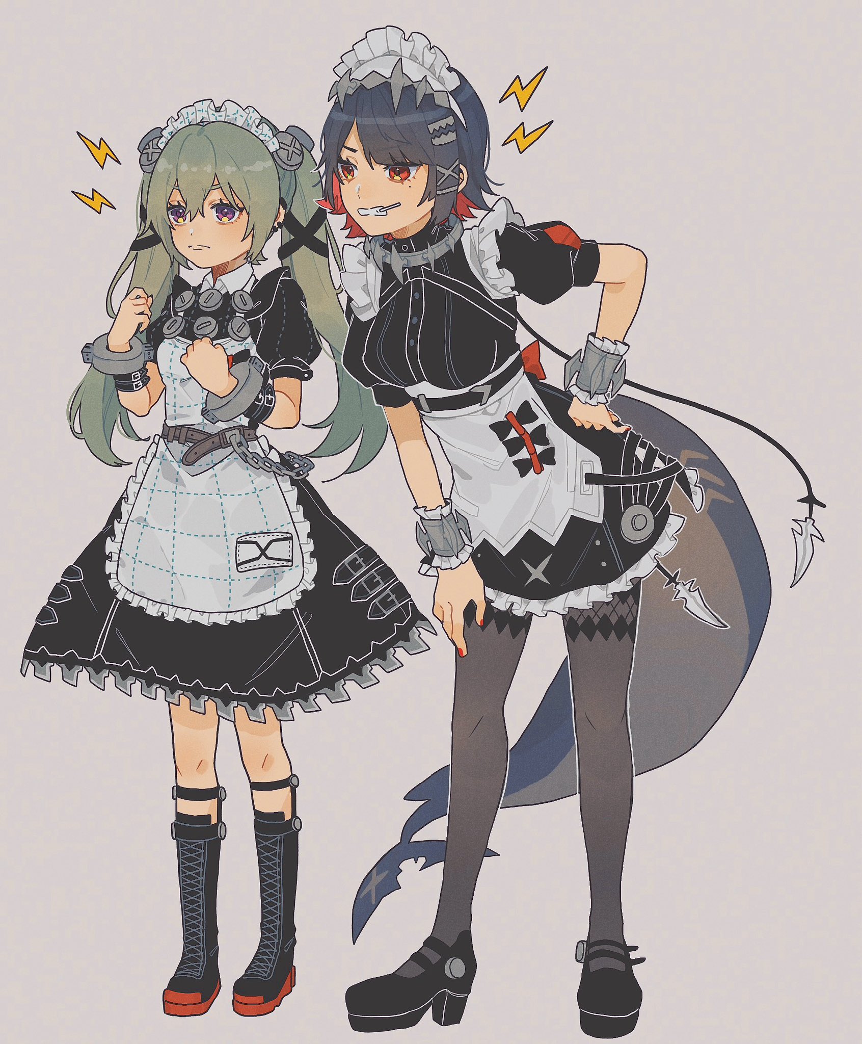 2girls animal_bag apron bear_bag belt black_dress black_footwear black_hair boots breasts brown_belt clenched_teeth colored_inner_hair commentary cuffs dress ellen_joe fins fish_tail frilled_dress frilled_wristband frills full_body green_hair grey_background hair_between_eyes hairband hand_on_own_hip hand_on_own_thigh hands_up height_difference highres huzizi_2222 knee_boots leaning_forward long_hair maid maid_apron maid_headdress metal_hairband mole mole_under_eye mouth_hold multicolored_hair multiple_girls puffy_short_sleeves puffy_sleeves purple_eyes red_eyes red_hair red_nails screw_hair_ornament shark_girl shark_tail short_hair short_sleeves simple_background spiked_headband untranslatable_commentary tail teeth twintails white_apron wrist_cuffs zenless_zone_zero