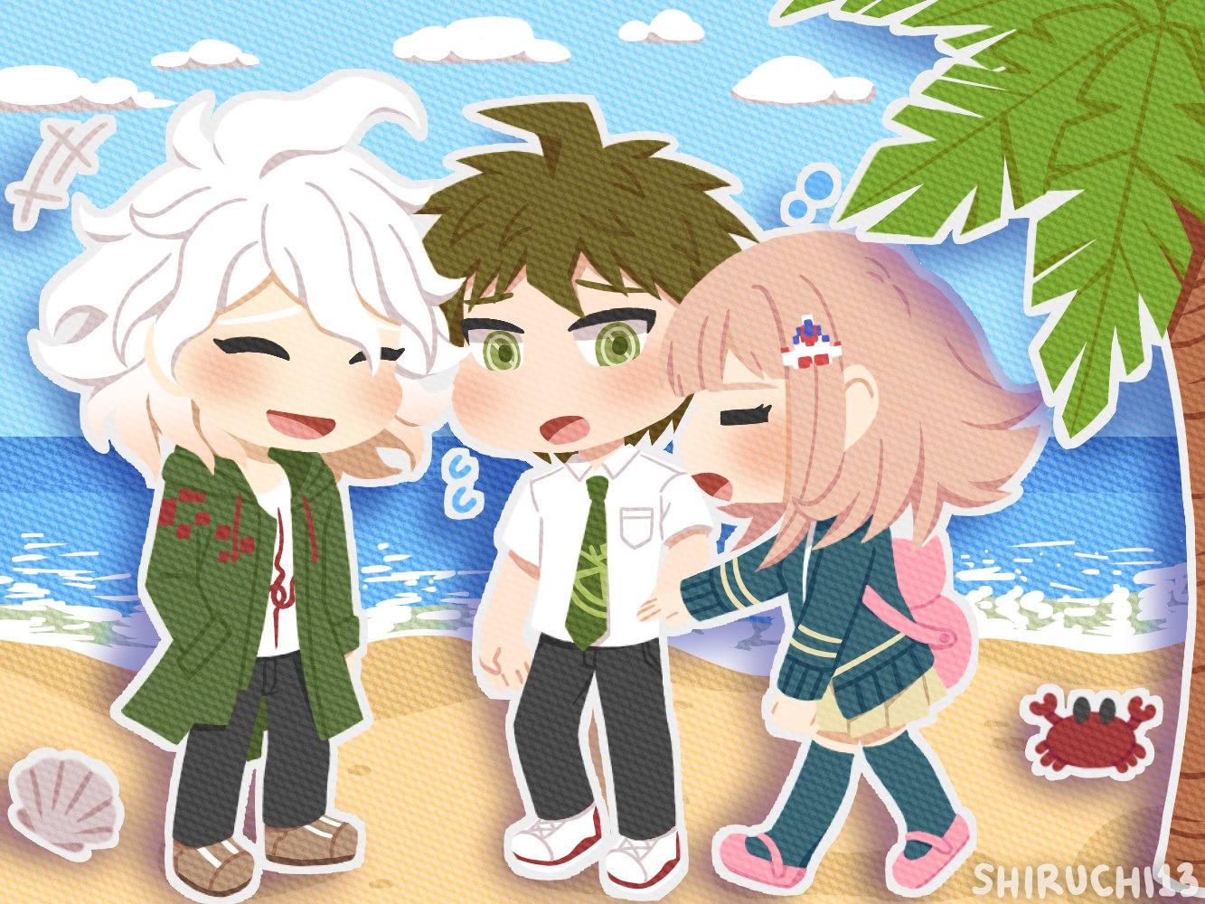 1girl 2boys ahoge animal_bag black_pants blush brown_hair cat_bag chibi cloud crab danganronpa_(series) danganronpa_2:_goodbye_despair day green_jacket green_necktie hinata_hajime jacket komaeda_nagito looking_at_another medium_hair multiple_boys nanami_chiaki necktie ocean open_clothes open_jacket outline palm_tree pants pink_bag shiruchi13 short_hair tree white_hair white_outline