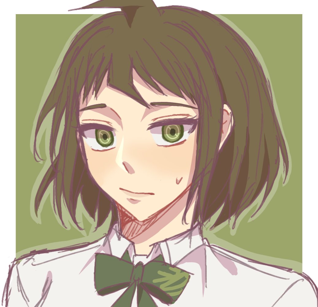 1girl ahoge blush bow bowtie brown_hair collared_shirt danganronpa_(series) danganronpa_2:_goodbye_despair genderswap genderswap_(mtf) green_background green_bow green_bowtie green_eyes hinata_hajime portrait shirt shiruchi13 short_hair smile solo sweatdrop white_background white_shirt