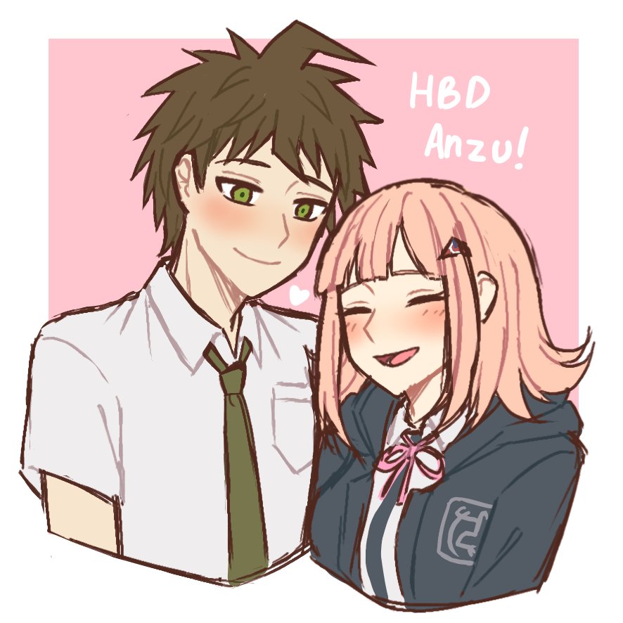 1boy 1girl ahoge black_jacket blush brown_hair cropped_torso danganronpa_(series) danganronpa_2:_goodbye_despair green_eyes green_necktie happy_birthday hinata_hajime jacket looking_at_another nanami_chiaki neck_ribbon necktie open_clothes open_jacket pink_background pink_ribbon ribbon shiruchi13 short_hair short_sleeves smile two-tone_shirt white_background