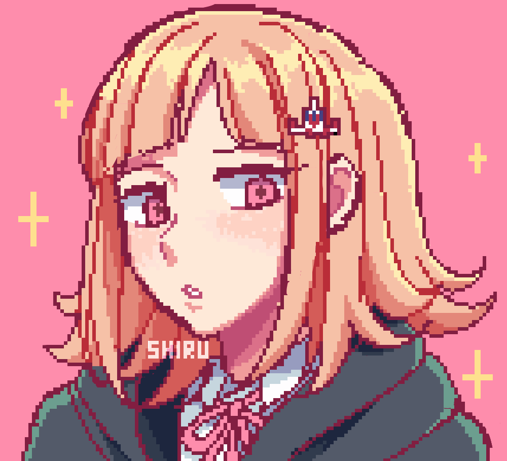 1girl blush brown_hair collared_shirt danganronpa_(series) danganronpa_2:_goodbye_despair hood hood_down hooded_jacket jacket medium_hair nanami_chiaki neck_ribbon pink_background pink_ribbon pixel_art portrait ribbon shirt shiruchi13 solo sparkle teeth