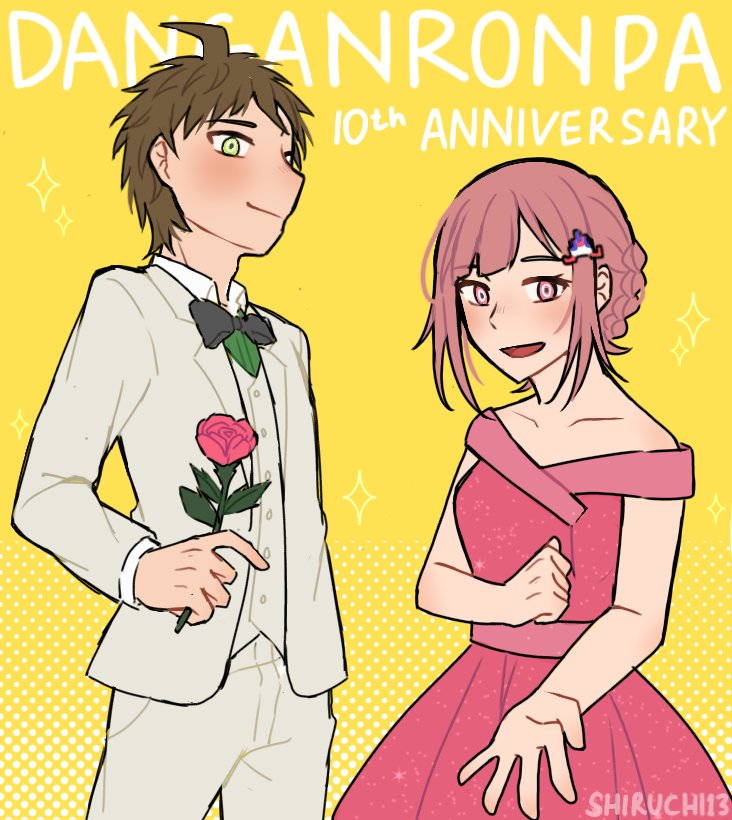 1boy 1girl :d ahoge artist_name bare_shoulders black_bow black_bowtie blush bow bowtie braid brown_hair collared_shirt copyright_name danganronpa_(series) danganronpa_10th_anniversary_costume danganronpa_2:_goodbye_despair dress flower formal_clothes grey_jacket hinata_hajime holding holding_flower jacket nanami_chiaki off-shoulder_dress off_shoulder open_mouth pants pink_dress pink_eyes pink_flower pink_rose rose shirt shiruchi13 short_hair smile vest white_pants yellow_background