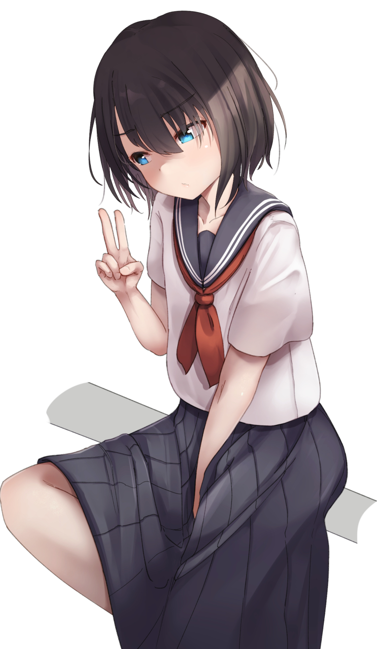 1girl black_hair blue_sailor_collar blue_skirt collarbone commentary_request highres koe_no_katachi nishimiya_yuzuru oren_(770len) sailor_collar school_uniform serafuku shirt short_hair short_sleeves simple_background sitting skirt solo v white_background white_shirt