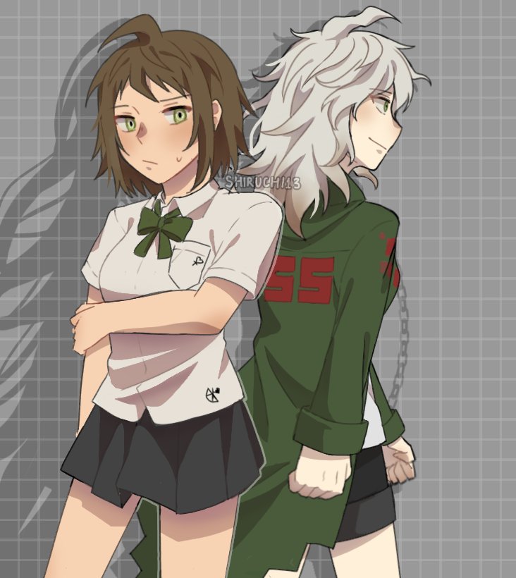 2girls ahoge back-to-back black_shorts black_skirt blush bow bowtie breast_pocket chain collared_shirt danganronpa_(series) danganronpa_2:_goodbye_despair genderswap genderswap_(mtf) green_bow green_bowtie green_jacket grey_background grey_hair hinata_hajime jacket kamukura_izuru komaeda_nagito long_hair long_sleeves miniskirt multiple_girls pocket shirt shiruchi13 short_hair shorts simple_background skirt spoilers
