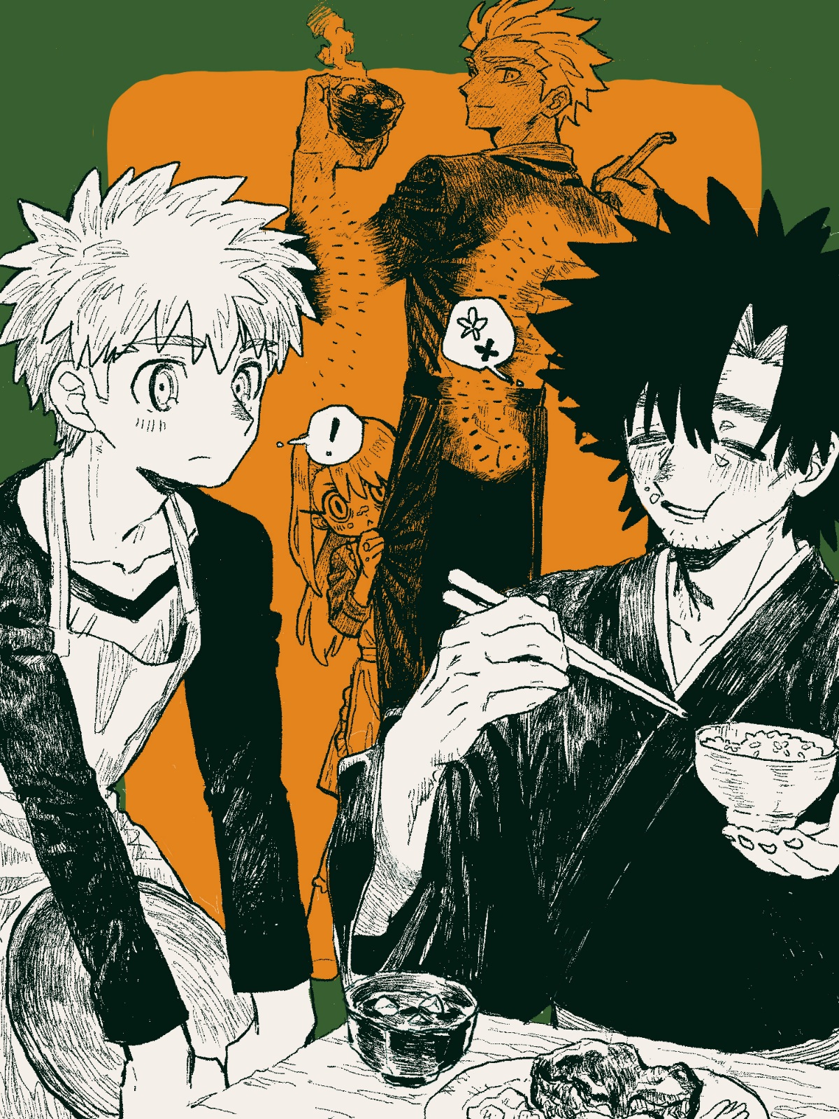 ! amemasu79 apron archer_(casual_wear)_(fate) archer_(fate) behind_another bowl eating emiya_kiritsugu emiya_shirou fate/zero fate_(series) food greyscale_with_colored_background highres illyasviel_von_einzbern looking_at_viewer plate speech_bubble spiked_hair