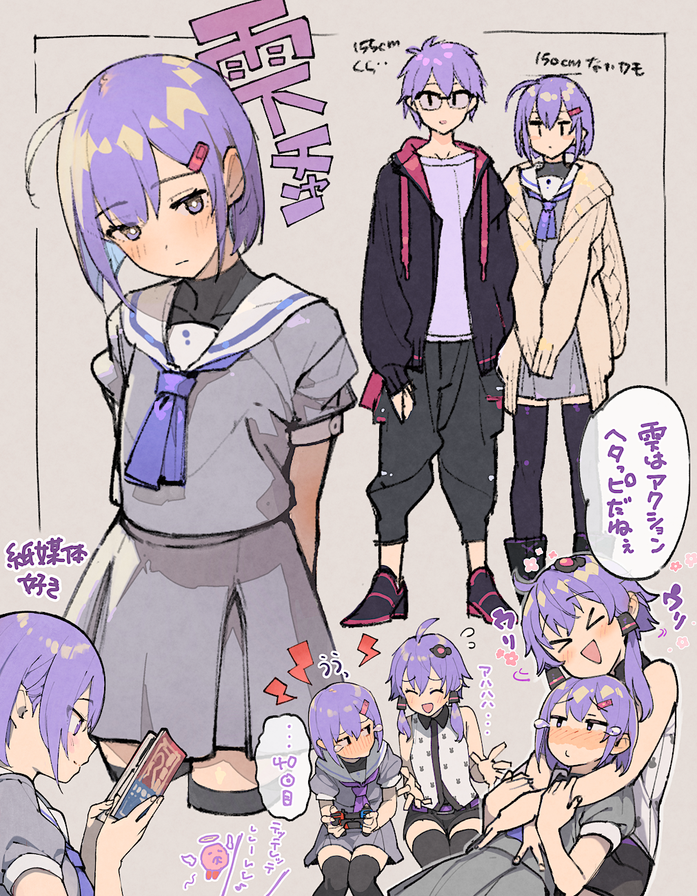>_< 1boy 2girls :d bodystocking cardigan closed_eyes commentary_request glasses grey_background hair_ornament hairclip height highres jacket kirby kirby_(series) looking_at_viewer multiple_girls nintendo open_mouth purple_eyes purple_hair sailor_collar school_uniform serafuku shirinda_fureiru short_hair short_hair_with_long_locks simple_background smile speech_bubble translation_request twintails voiceroid yuzuki_yukari yuzuki_yukari's_younger_twin_brother yuzuki_yukari_(a.i._voice) yuzuki_yukari_(shizuku)