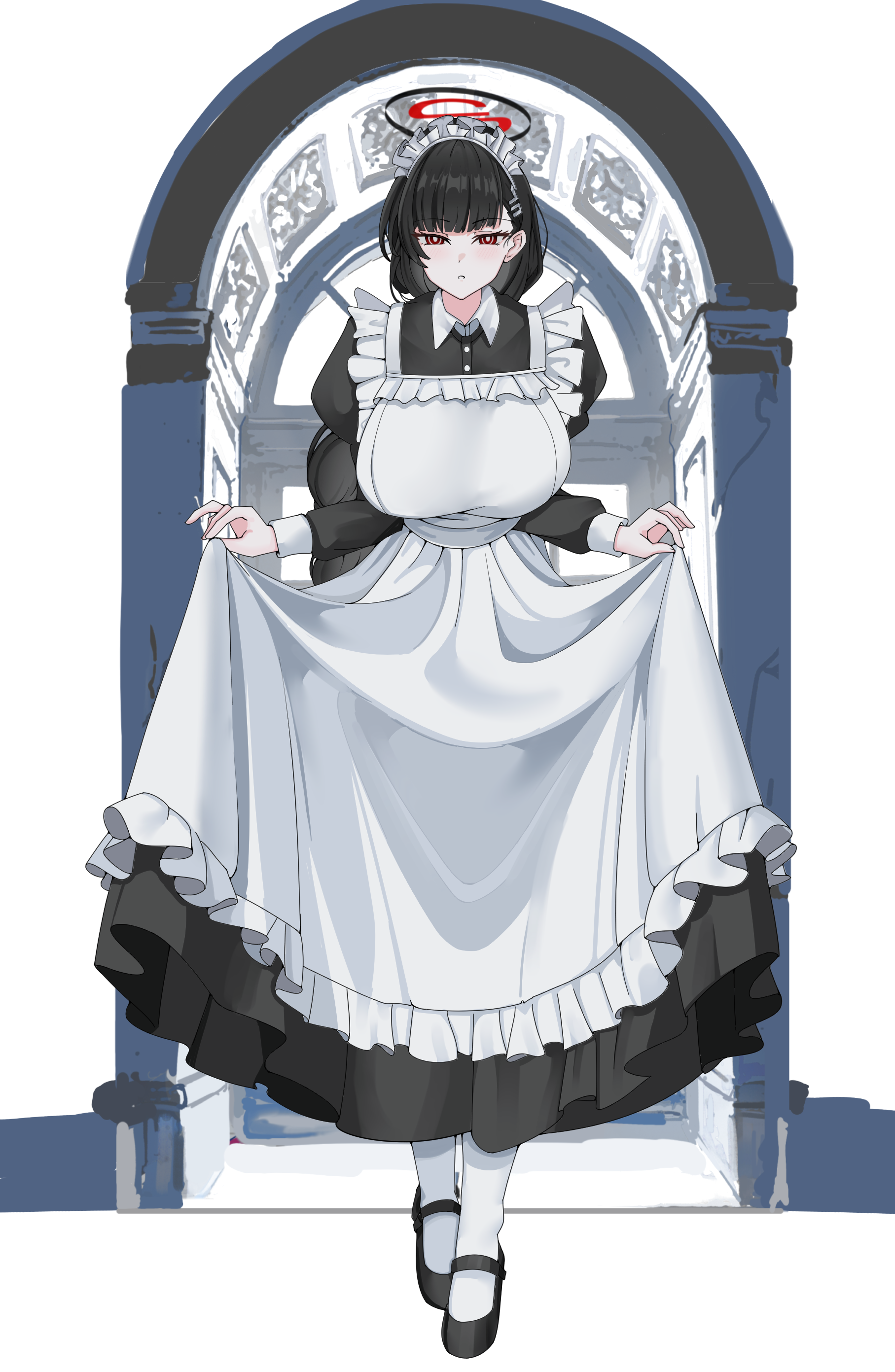 1girl absurdres alternate_costume apron black_hair black_shoes blue_archive breasts enmaided full_body hair_ornament hairclip halo highres holding_own_dress large_breasts lengkuass lifting_own_clothes long_hair looking_at_viewer maid maid_apron maid_headdress mary_janes red_eyes ringed_eyes rio_(blue_archive) shoes socks solo white_socks
