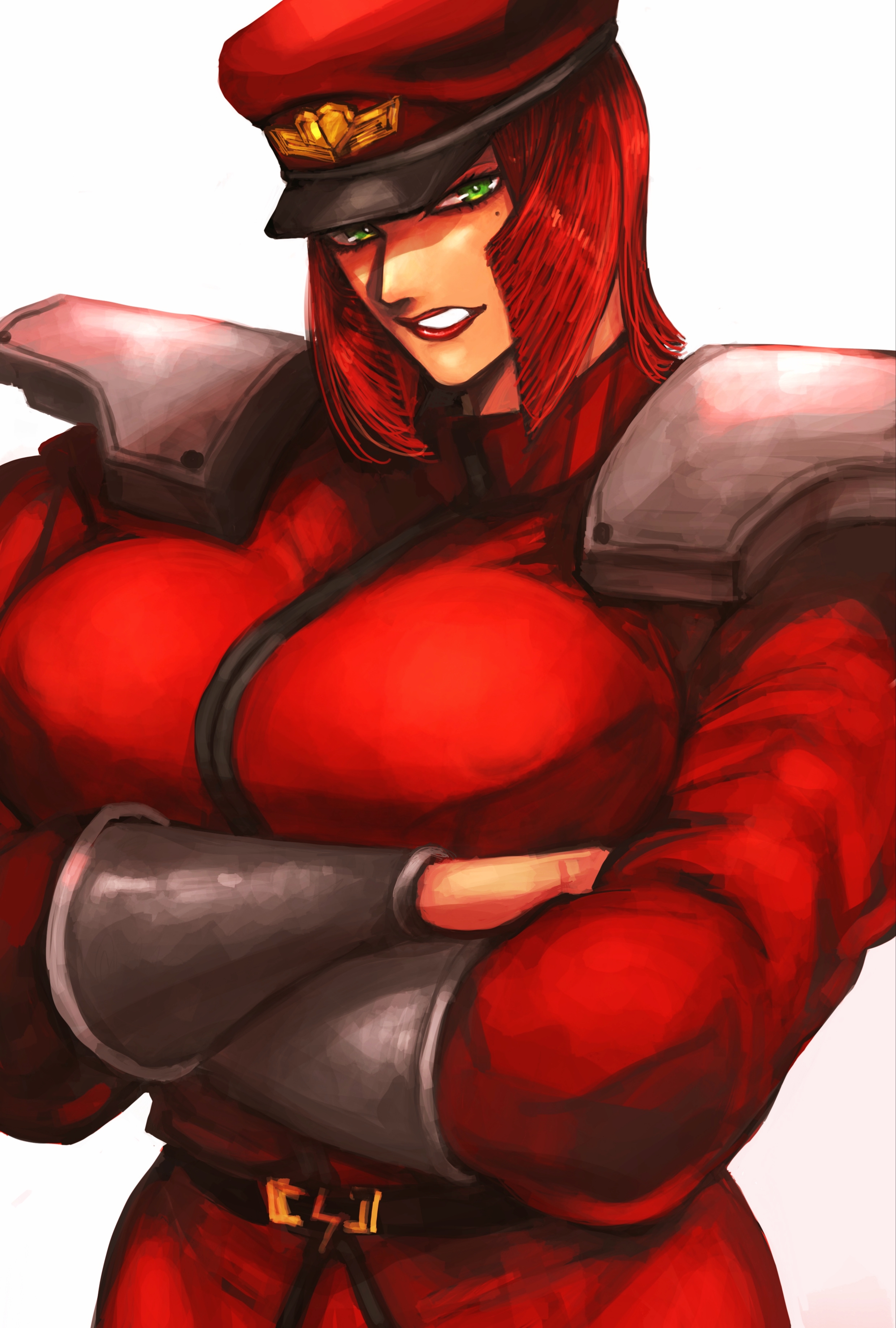 1girl absurdres belt black_belt bracer breasts cosplay crossed_arms green_eyes hat highres large_breasts lightning_bolt_symbol m._bison m._bison_(cosplay) marisa_(street_fighter) mole mole_under_eye muscular muscular_female peaked_cap shoulder_pads solo street_fighter street_fighter_6 white_background zuman_(zmnjo1440)